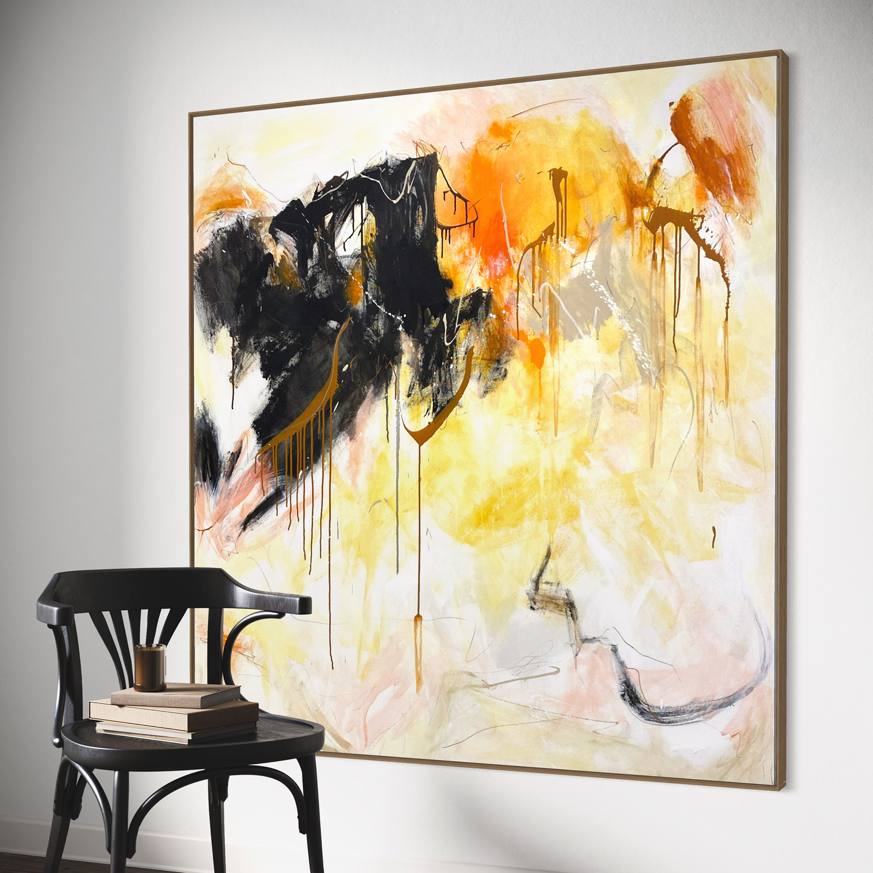 This large painting has areas of texture and gestural marks in paint and pencil across the canvas surface. It’s striking palette consists of beige, white, black, grey, brown, lemon, ochre, blush, apricot, and orange.