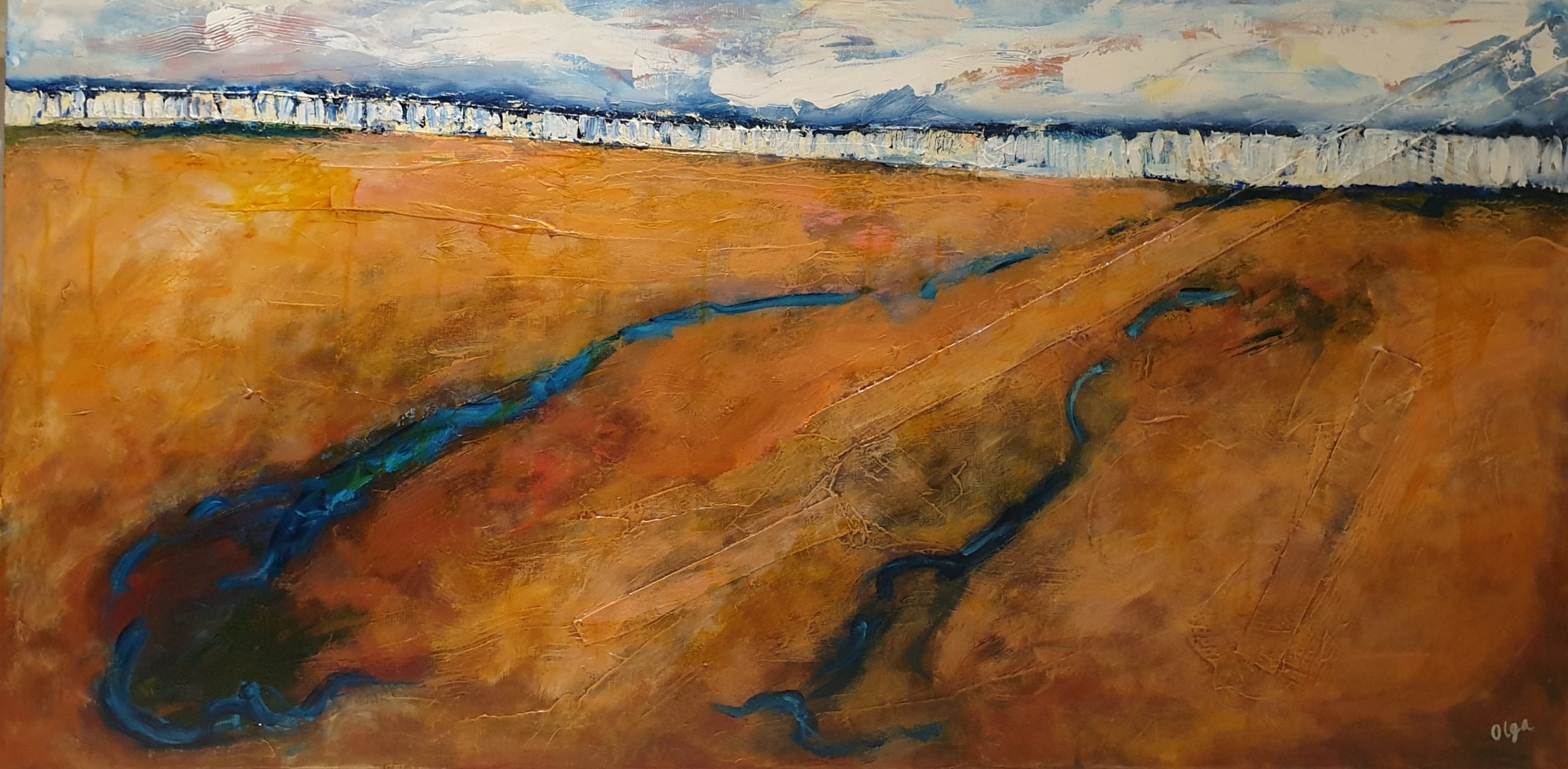 This landscape contains beautiful, multiple layers of texture and colour. Truly more beautiful in real life. It glows with rich ochres, sienna and greens. Broad confident strokes of the palette knife are evident. Texture has been created with areas of paint and strips of canvas. It is a stunning piece.