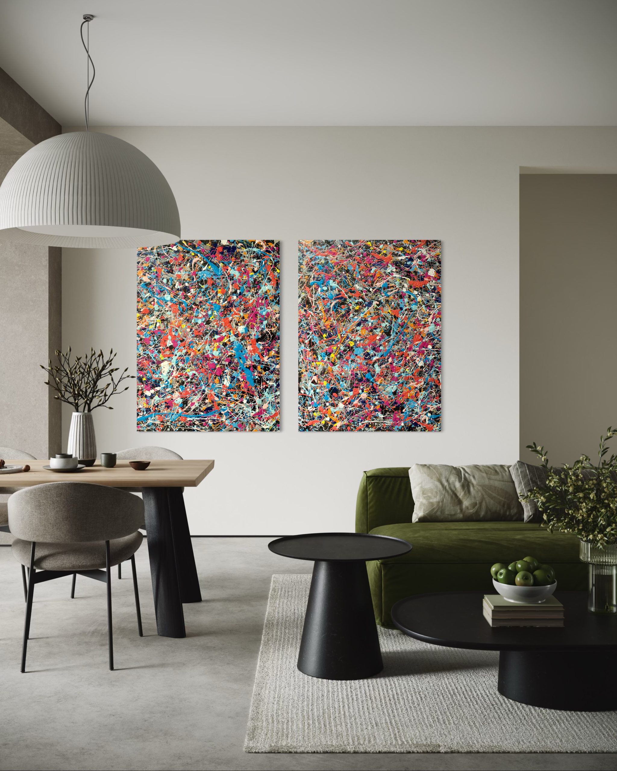 This textured energetic two piece engages with vibrant splashes, invoking the chaotic harmony of abstract expressionism.