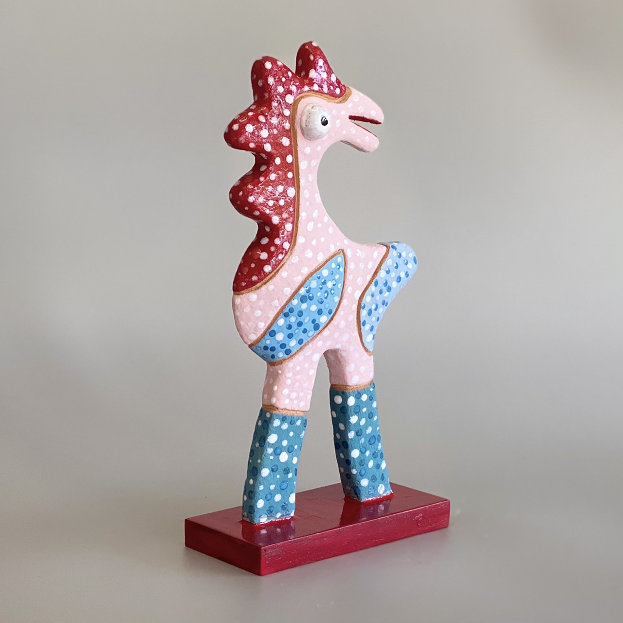 Bouncy Rooster by Stefan Mager – Energetic rooster with bright red comb and azure wings. Mounted on a hardwood base.