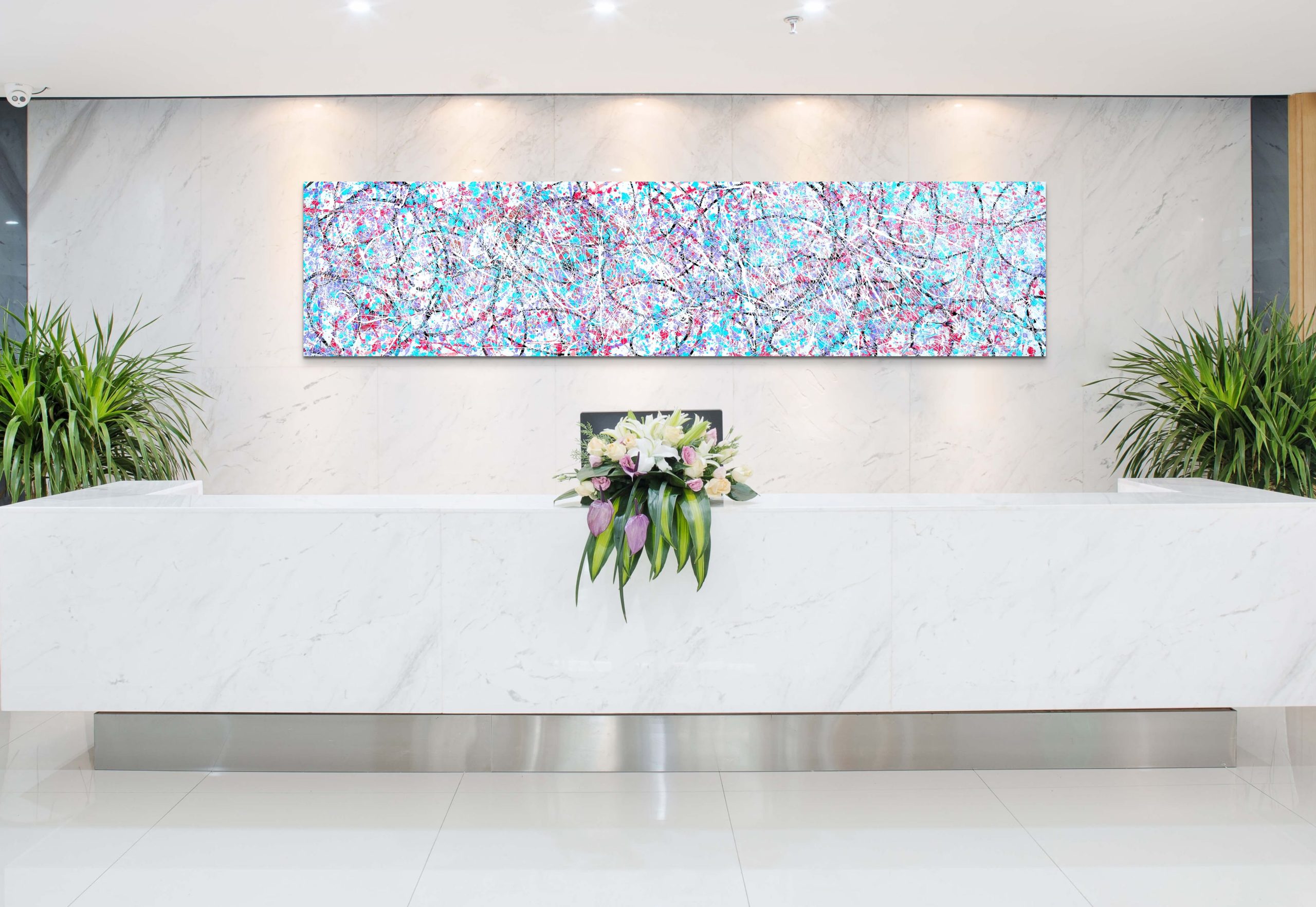 Bounded Delight by Estelle Asmodelle – This painting explores bounded areas of abstraction with colours that offer a refreshing relief from the black lines. This work is painted in the style of abstract expressionism.