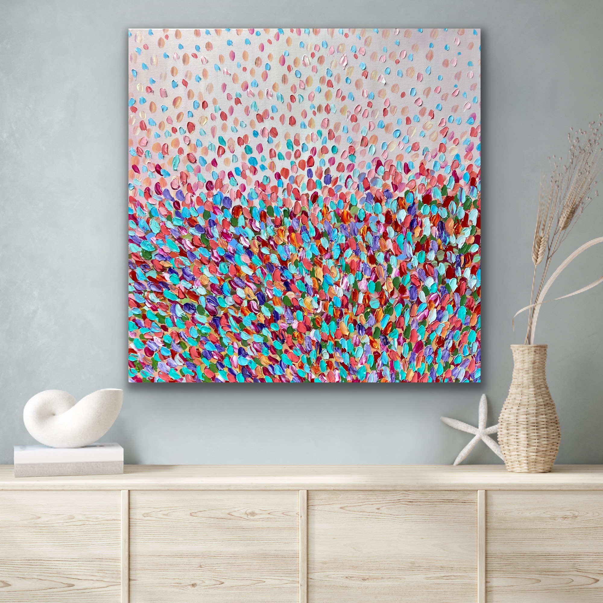 Bouquet by Theo Papathomas petals painted in thick and luscious oil paint covering the canvas. The landscape becomes a bouquet of petals dancing over the land. I painted the painting with a pallet knife to create so much textured and give a lot of depth to the painting with a beautiful light colours in the background. I tried to create this beautiful composition of colours of the lavender infused with other petals swept by the winds. A very harmonious and tranquil composition that brings happy memories. The painting is signed and dated 2021 at the back and comes with a certificate of Authenticity.