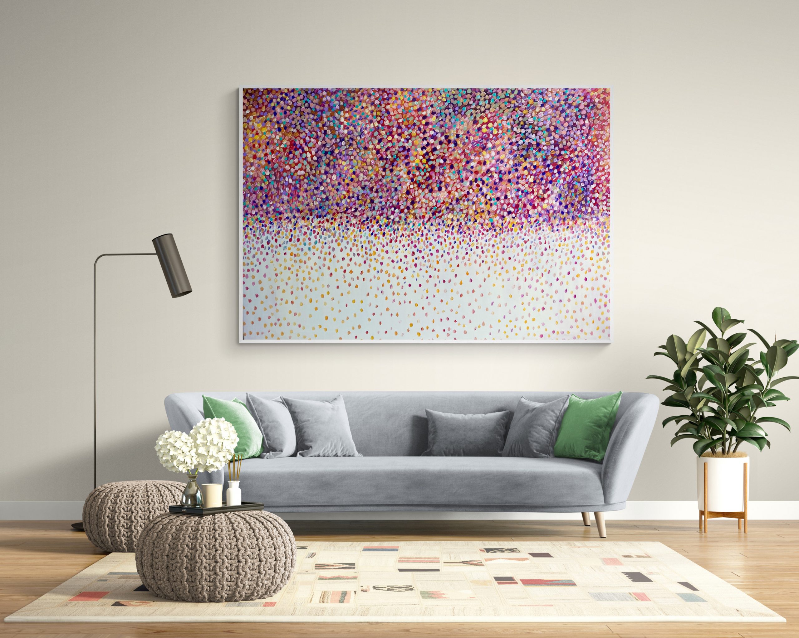 Bouquet in the Sky by Theo Papathomas a beautiful rainbow of petals falling onto the landscape like fireworks of petals in the sky. Petals like musical notes dancing to their own song creating their own rainbow of Love. Beautiful lavender colour petals weeping in the sky creating a beautiful bouquet of Petals in the Sky. Hope with this work it makes the viewer feel very peaceful and tranquil. I tried to create so much depth in the painting with a beautiful light sky . The painting doesn’t come with an external frame. The painting is signed and dated 2021 at the back and comes with a certificate of authenticity.