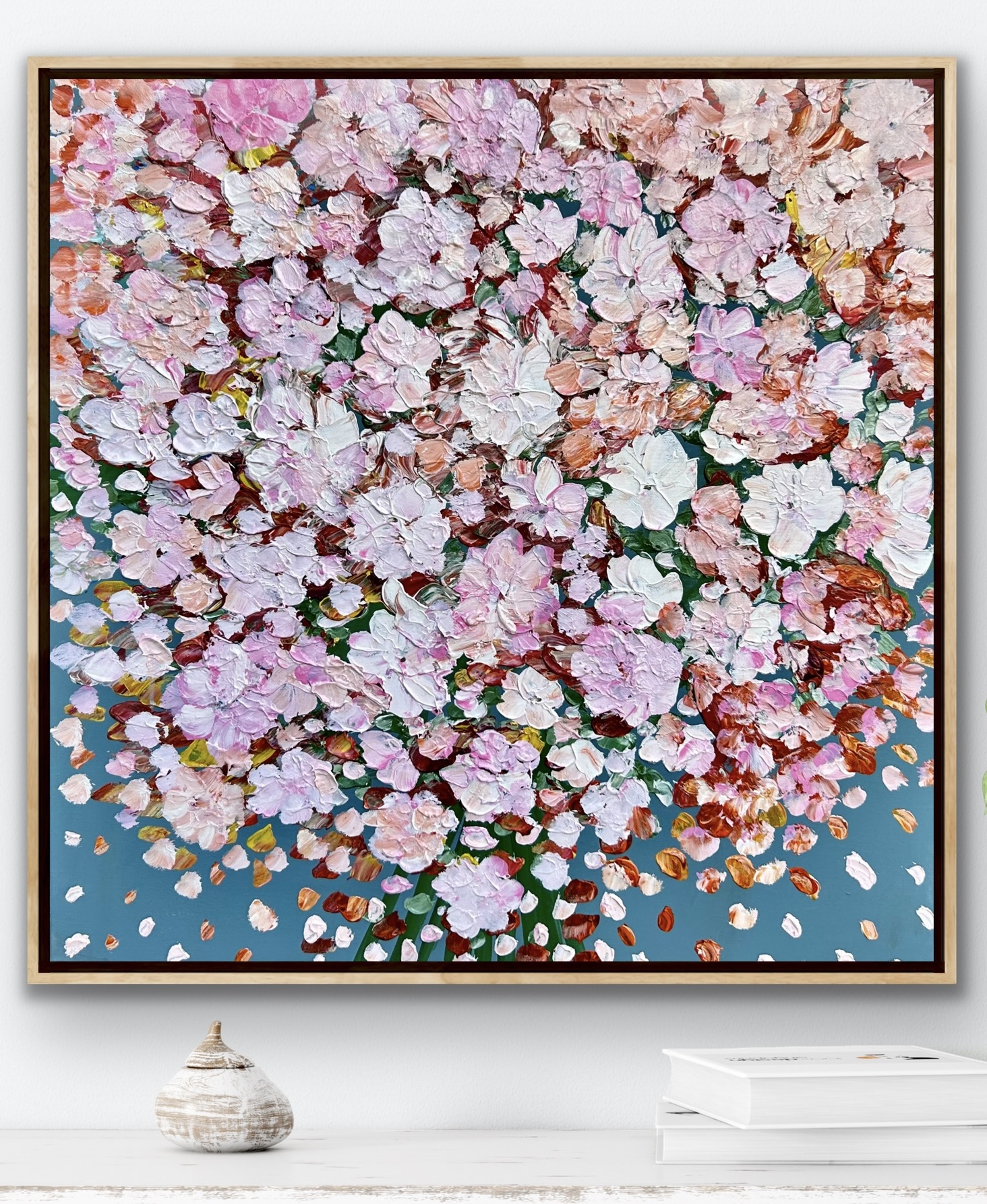 Bouquet of Pastels by Theo Papathomas is painted with a pallet knife to create so much texture. A beautiful bouquet of flowers and petals painted with lots of expression and freedom to create movement and rhythms . A very peaceful and tranquil painting with so much depth . The painting does not come with an external frame.The painting is signed and dated  at the back and comes with a certificate of Authenticity.