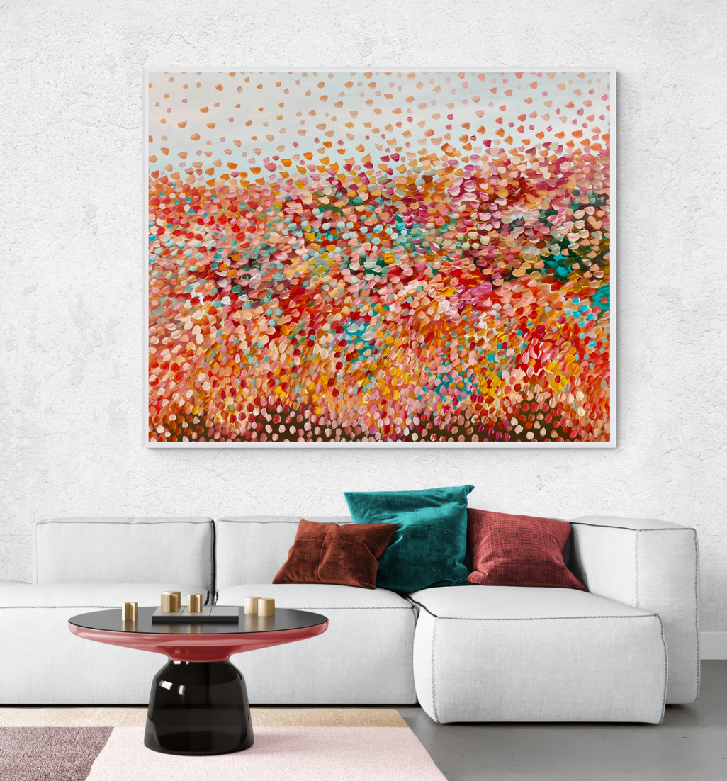 Bouquet of Romance by Theo Papathomas a painting with warm and cool colours of the petals flying in the wind creating this beautiful bouquet of petals covering the hills with lots of layers of paint. Beautiful flickering petals dancing over the landscape shining like stars. Petals weeping onto the landscape creating this veil of petals covering the hills in soft olive, pinks and earthy colours . A composition of colours and rhythms of petals dancing like musical notes in the sky making this painting very gentle and poetic painting . A very peaceful and tranquil painting with so much depth. The painting does not come with an external frame.The painting is signed and dated 2021 at the back and comes with a certificate of Authenticity.
