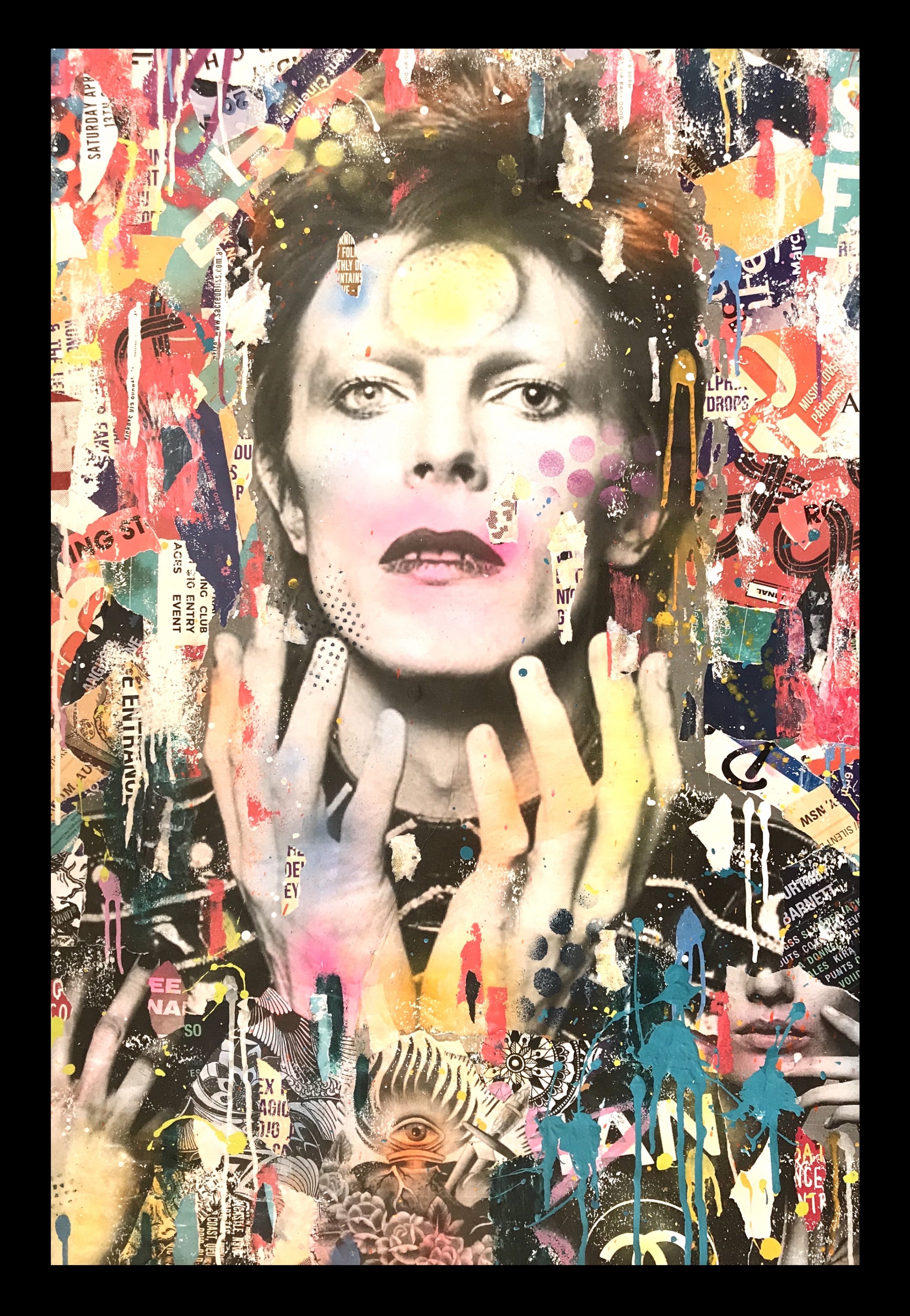 This artwork has a textured finish created by built up layers, paint splatters and torn paper, a visual effect mimicking the look you would see in the street where this effect is created over time. These imperfections are part of the overall look and feel of the finished work.