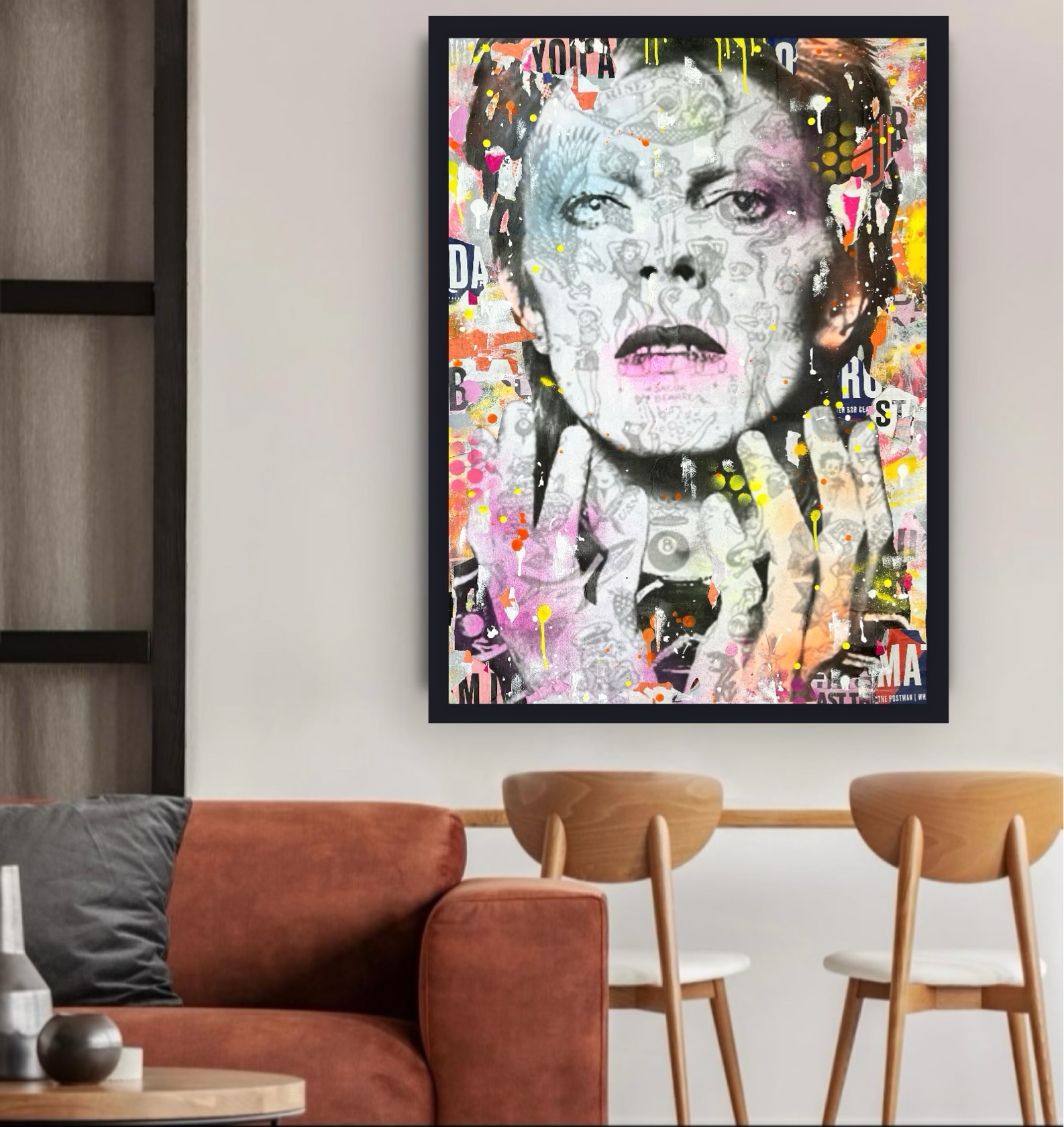 The main Iconic Bowie Image was then added with Vintage Flash Tattoo skin, and then further overlaid with lot of layers of paint and street posters to give a worn rustic appearance.