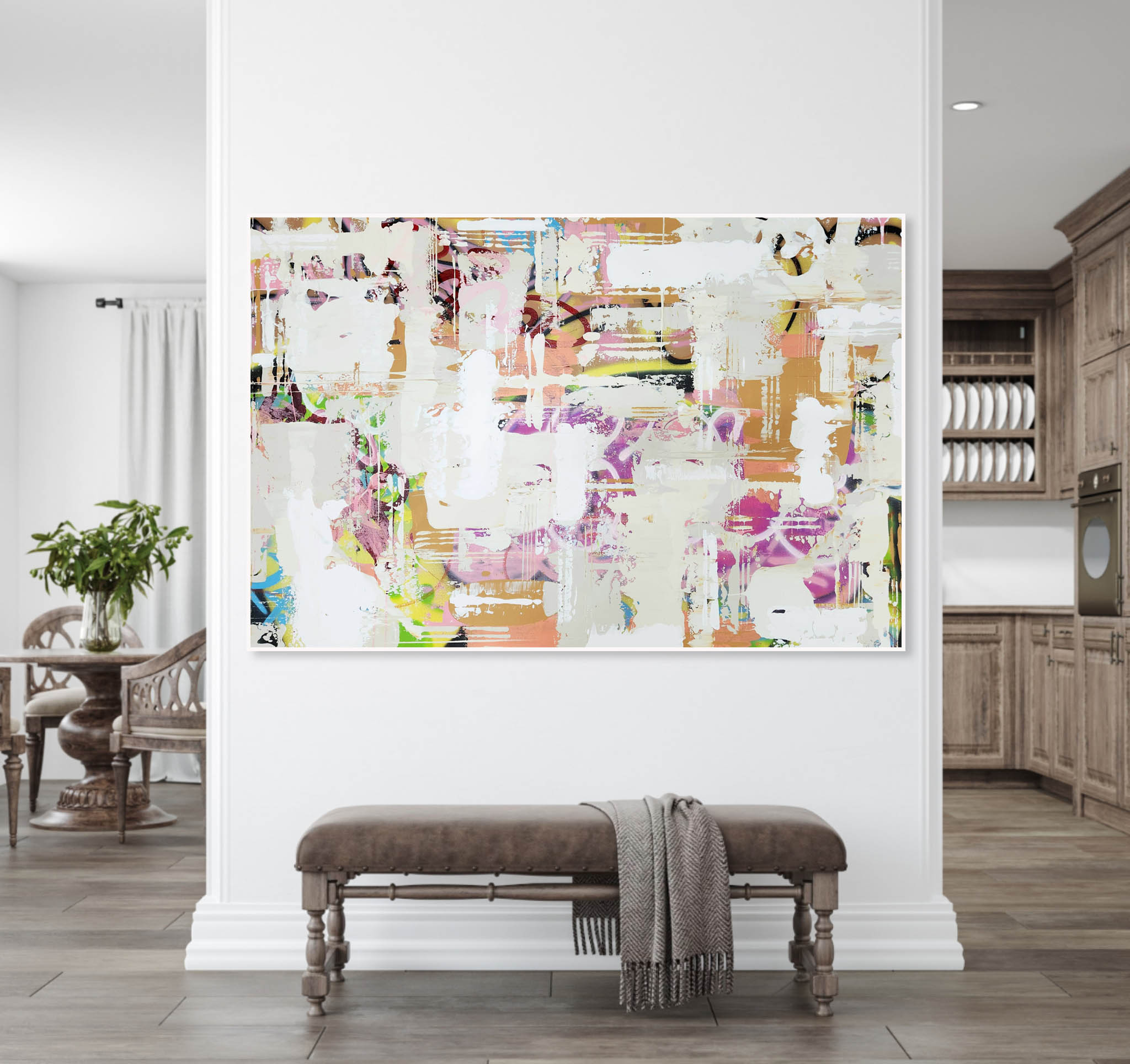 At first glance, the artwork pulses with moody purples and soft beiges, but as the eye lingers, more begins to surface—unexpected pops of yellow, electric blue, and a striking ink-marker pink bleed through the layers like memories refusing to fade. The depth reveals itself slowly, offering a visual experience that evolves with each moment of attention. Faded whites soften the chaos, creating balance amidst the boldness.