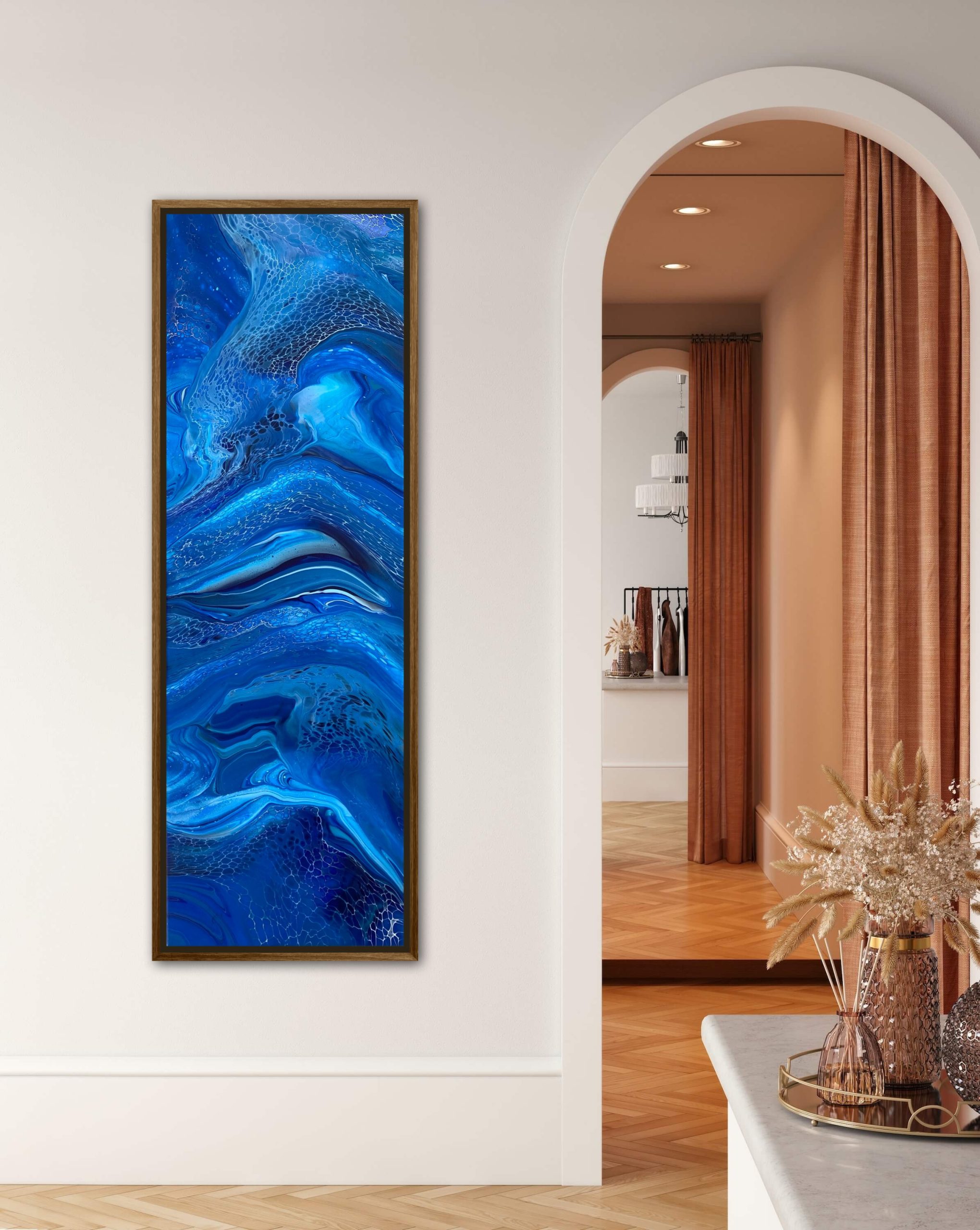 A calming flow of blue which draws you in and across the canvas, with organic cellular patterns, and foamy waves.
