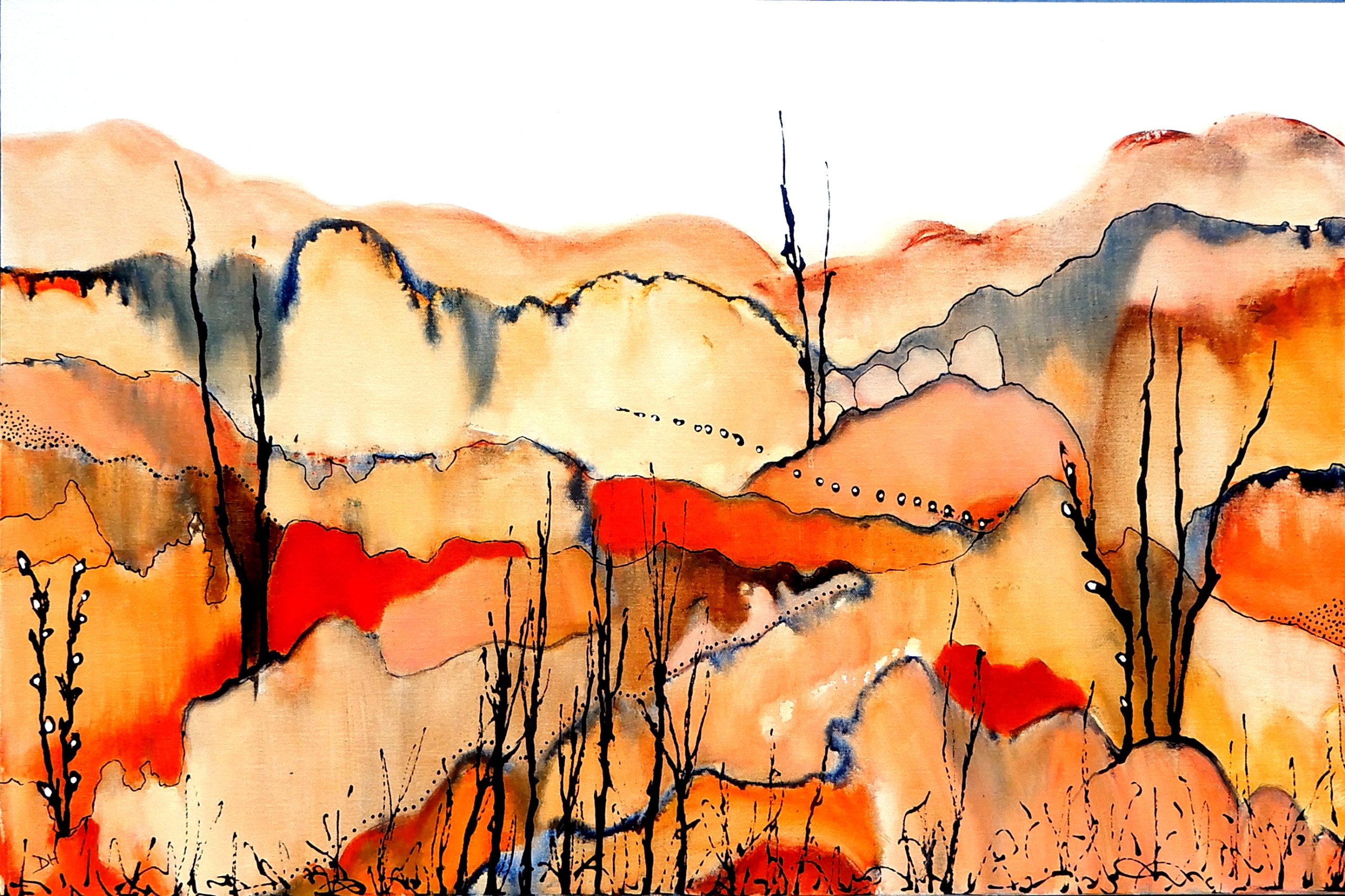 Inspired by country in the NT, this bold, bright painting explores the rhythms and colours of the landscape, rich with hills and ridges and vibrant earthy tones.