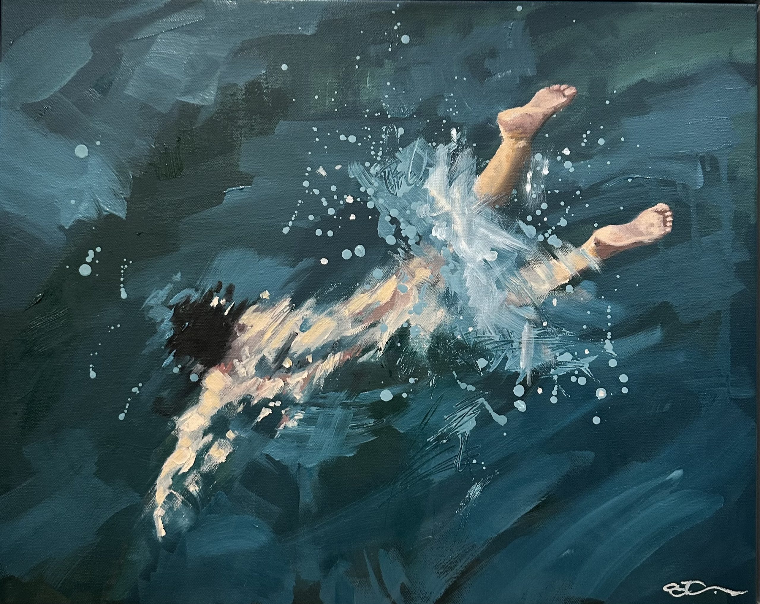 Break Apart by Amanda Cameron – is one of a new series called ‘Salt Water’. While still exploring the interaction and connection between water, light and form, this series also analyses the sense of disquiet when swimming in deep ocean water. At the same time, the main focus is the quest for refuge, quietness and escapism. These paintings juxtapose the lone swimmer and a few minutes of introspection when alone in deep water against the fear of the unknown. The constant struggle between hyper-realism and having a painterly quality to my work is a conflict I always try to balance; therefore, thick paint and evident brush strokes are present when viewed up close. This piece is painted in professional oil paints on a museum-quality canvas and finished with edges painted, varnished for protection and framed in a quality white floating box frame. It comes ready to hang and includes a certificate of authenticity.