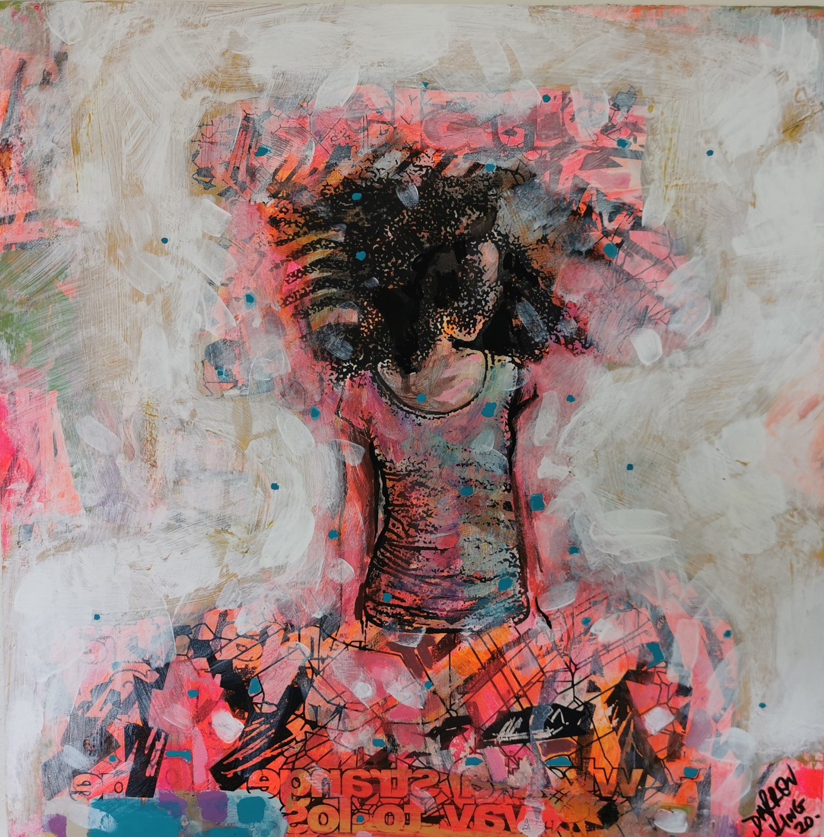Breaking free of stress and music as release are the main themes behind this piece. Music is one of the things I find most inspiring, I am constantly craving new music and always listening to something. Favourite lyrics often make an appearance in my work. Loads of layers, some screen printed directly onto the board, some painted combine to create this busy colourful artwork.