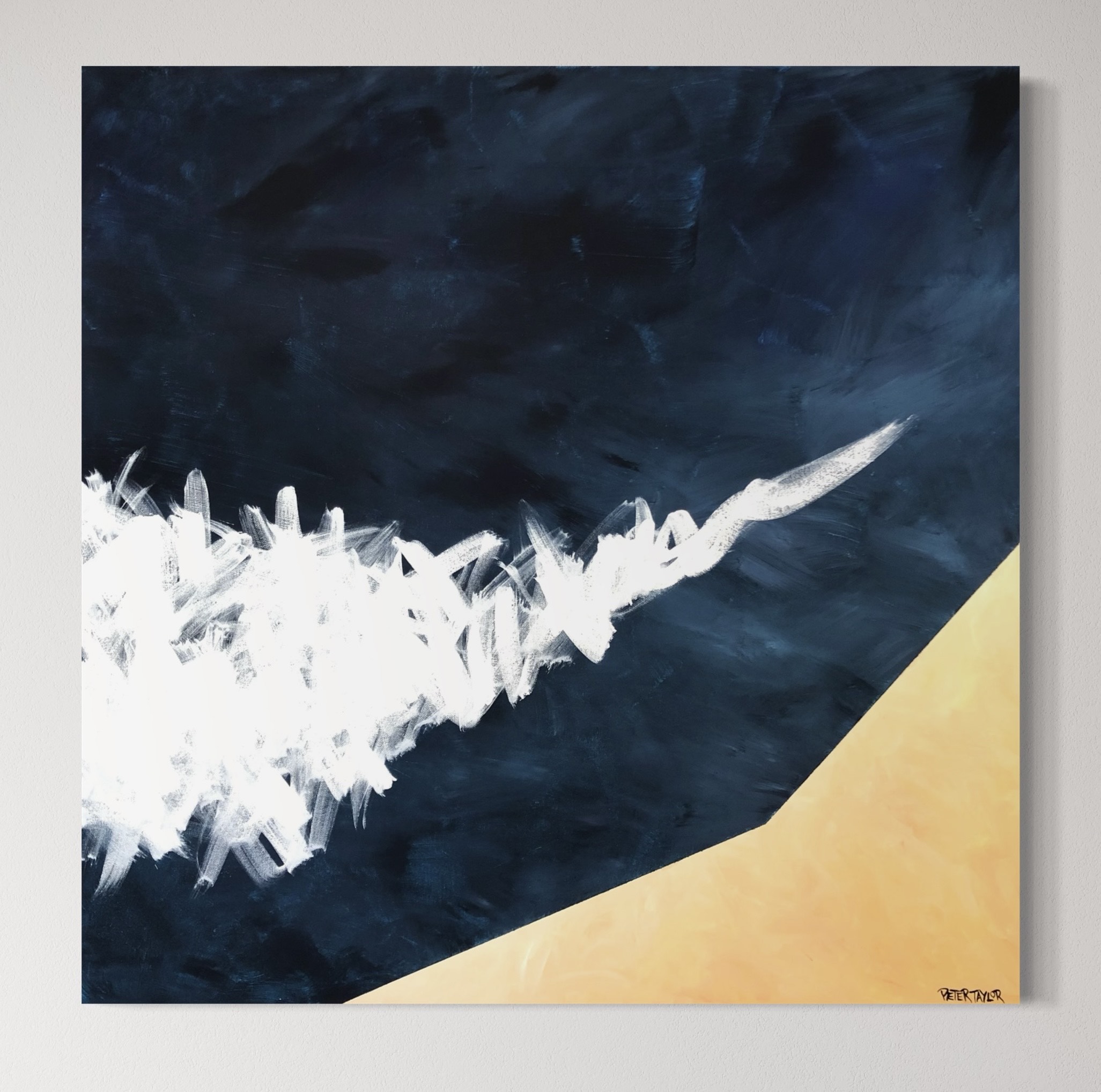 This captivating minimalist painting features the deep blue of the ocean, illustrating the dynamic movement of crashing waves. In contrast, a gentle depiction of a sunlit golden sandy beach invites viewers to imagine the soothing sound of the surf and the warmth of the sun on their skin. The interplay of colors conveys a sense of tranquility and depth, evoking the beauty and power of nature. – by Australian artist Peter Taylor.