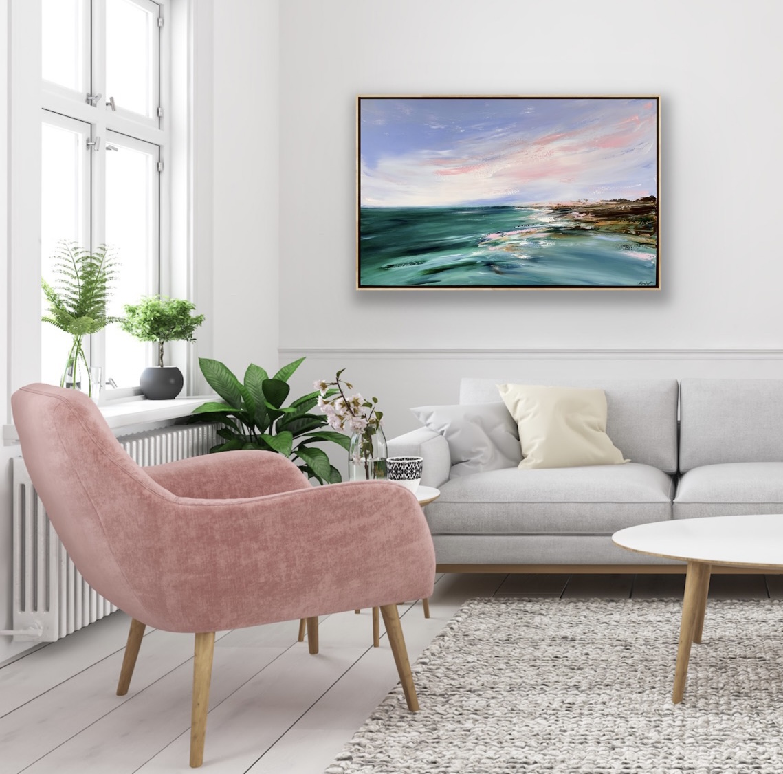 Some days you just have to breathe deeper and exhale louder. On days when it all seems too hard, taking time to check in with ourselves is not just a want, it’s an absolute need. I often find myself flustered and overwhelmed if I don’t take time out for myself. Of course I’d love to be able to run away to the coast every time I need to shift focus and recenter, but on days I can’t, I paint. This bold statement seascape was created on one of those days, when I just had to withdraw to my studio, and paint. I couldn’t get to the coast so I created it on the canvas. My happy place. And in doing so, I was able to do exactly what was needed, breathe deeper and exhale louder.