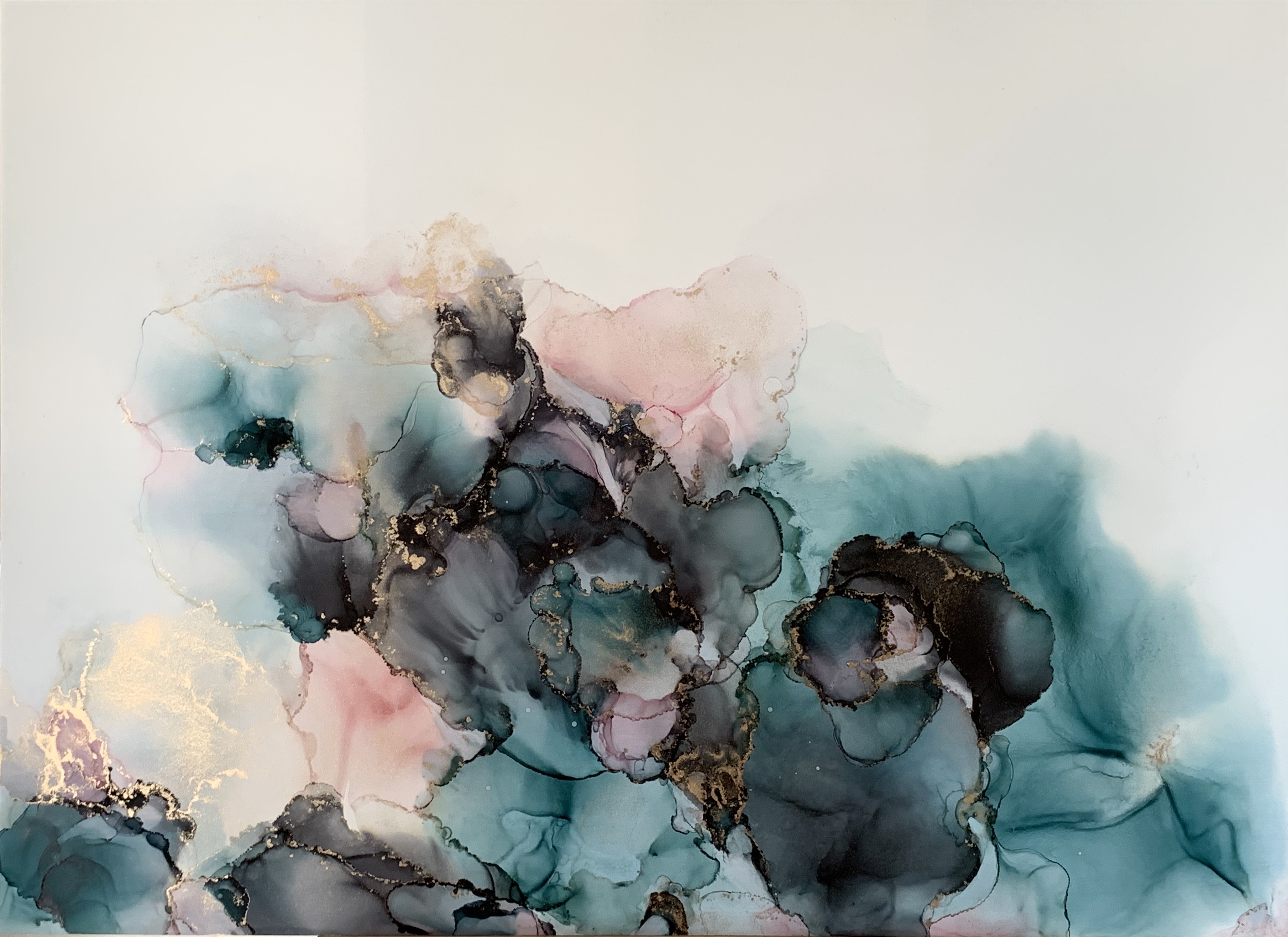“Breathing Space” was created after a tough week when I instinctly reached for my favourite colours and got lost in the creative process. This piece was like a giant exhale for me…it gave me space to refocus, be still, and just breathe. The soft blush pinks and soothing greens interlaced with charcoal and metallic brass created a gorgeous piece I find very calming – I hope you find it calming too.