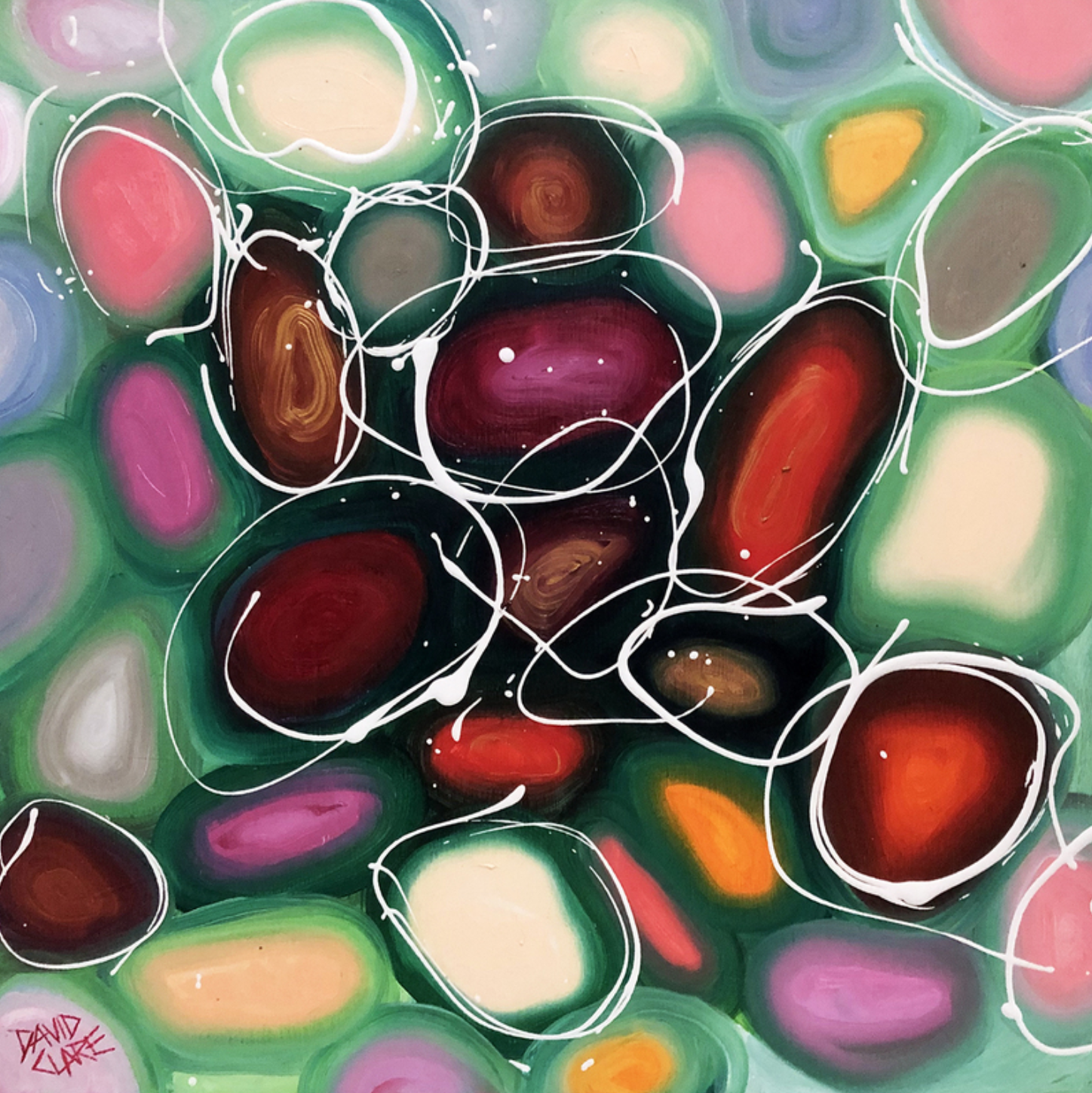 Bright Red And Green Pebbles by David Clare – A bright colourful oil painting of abstract pebbles in a shallow stream. Another painting from my series of abstract, colourful pebbles. Created by carefully blending rich oil colours, then quickly dripping pure white paint randomly to suggest water ripples as the pebbles break the surface of the shallow water.