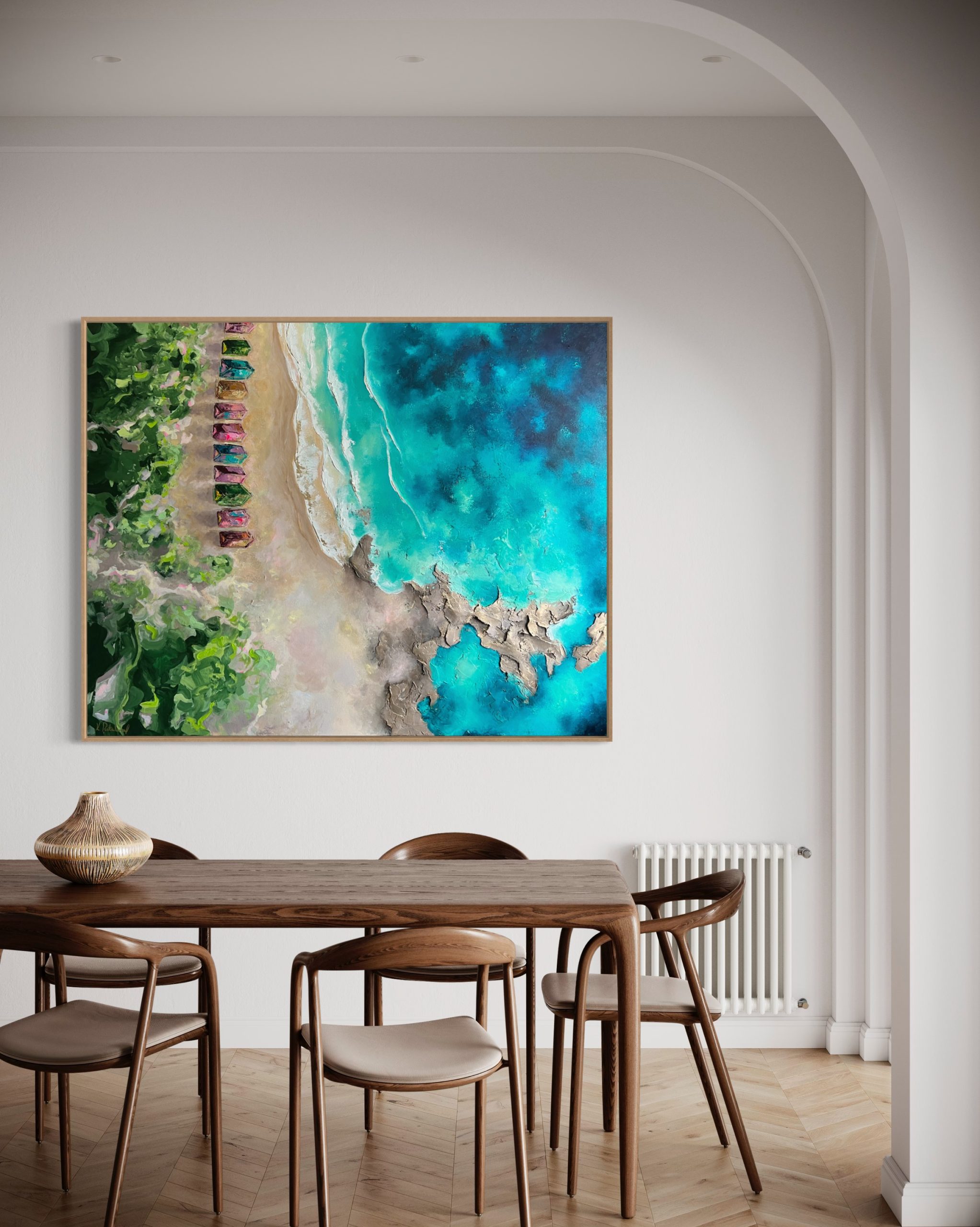 Some of my canvases are ordered with a float frame, usually the most popular is a Tasmanian oak frame. If you prefer to frame the piece once the painting is finished, I can assist you in organising a custom frame or you can choose to arrange framing yourself.