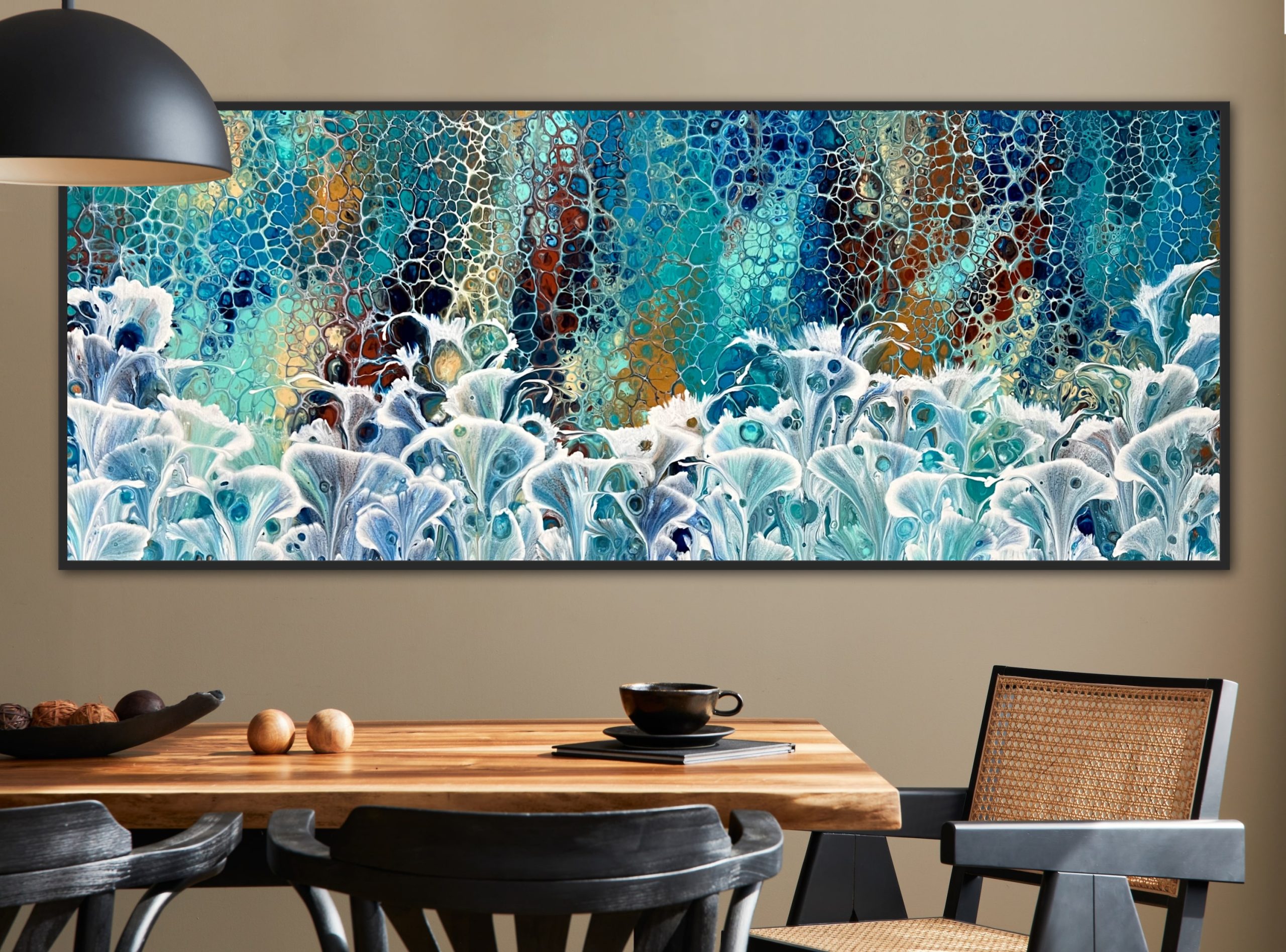 Brimming Valley is inspired by nature and depicts in abstract Calla Lilies growing tall and in abundance with a lush valley full of colourful flora behind. Created using various techniques combined to allow increased flow, interaction and separation of colours to create interesting patterns where pops of colour can be seen emerging from underneath. This added dimension adds lace and cells to the artwork creating an interesting and one of a kind painting that can never be replicated.