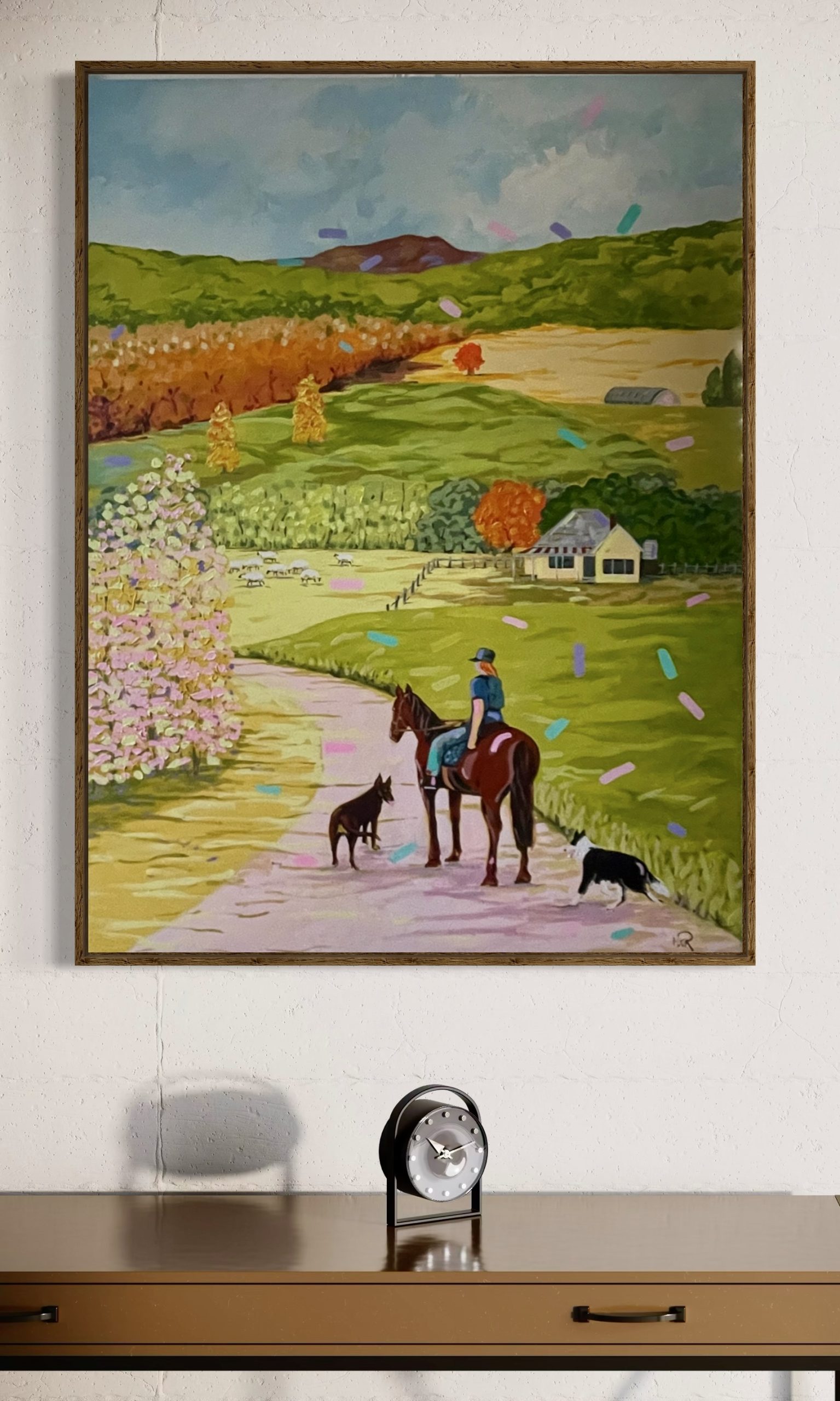 This acrylic painting on a stretched canvas comes with a floating frame made from recycled timber. It has a back wire so is ready to hang and enjoy.