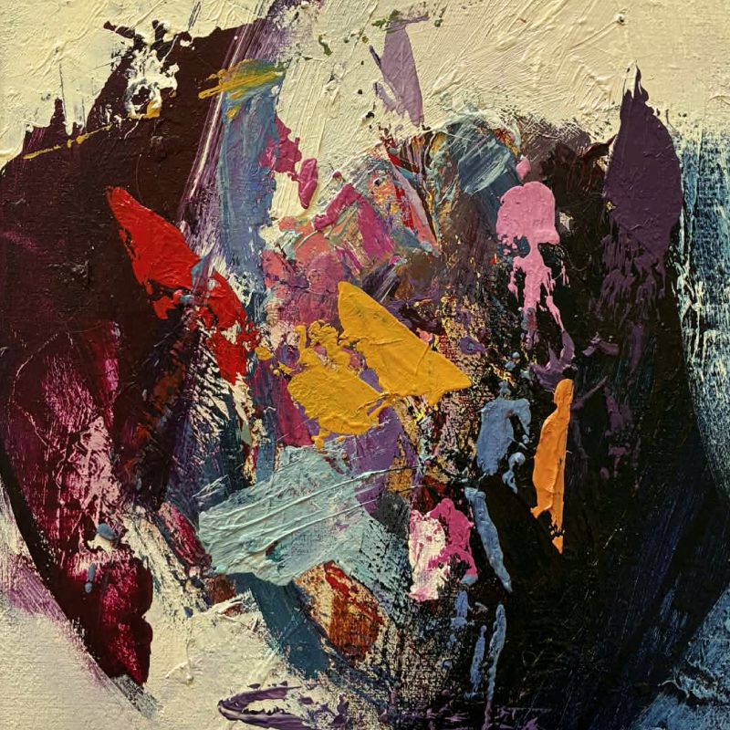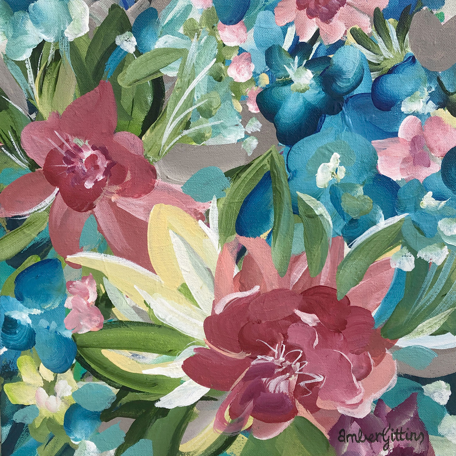Bringing Sunshine  – 30×30 small abstract floral landscape by botanical artist Amber Gittins. A gorgeous colourful abstract of blossoming flowers in a springtime garden. Bold and joyful little artwork that you can either hang or it will sit nicely on your benchtop of bookcase.