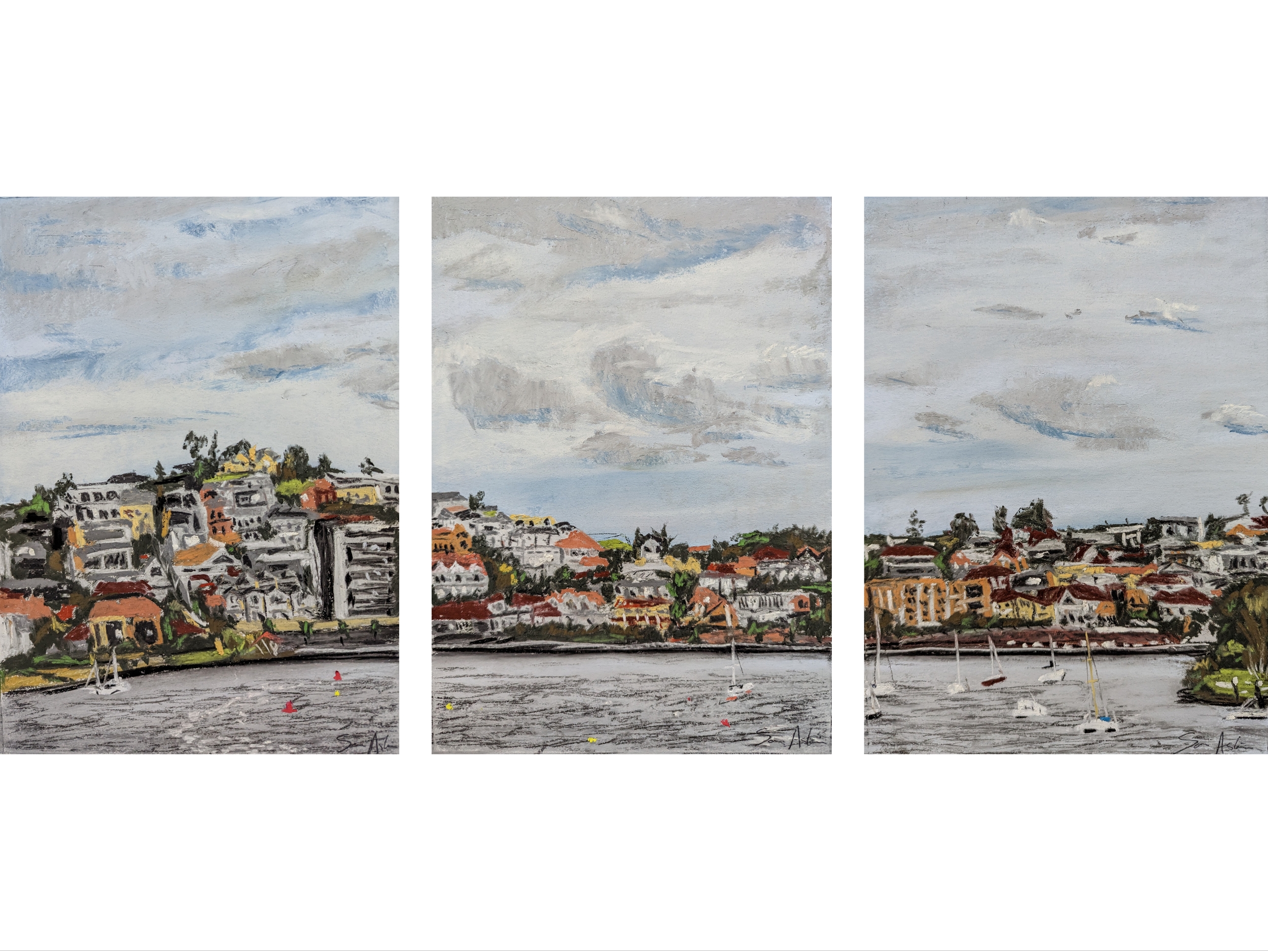 This listing is a series of three connected pieces in a triptych of the Brisbane River. The Brisbane River is a winding, ever changing cityscape and landscape that evolves every day. Pairing that with the often sudden changes in weather that Brisbane can experience, particularly in the Summer, and it becomes a great source of inspiration. Even on a moody, overcast day like the one represented in this work, the colour variation in the classic houses lining the river brighten the view from this riverside balcony. Shifting boats, cars, people, planes and clouds measn that you will never get exactly the same view twice. That feeling of an iconic scene mixed with the beauty of the day is what I have captured in this piece, and I hope that resonates with you too.