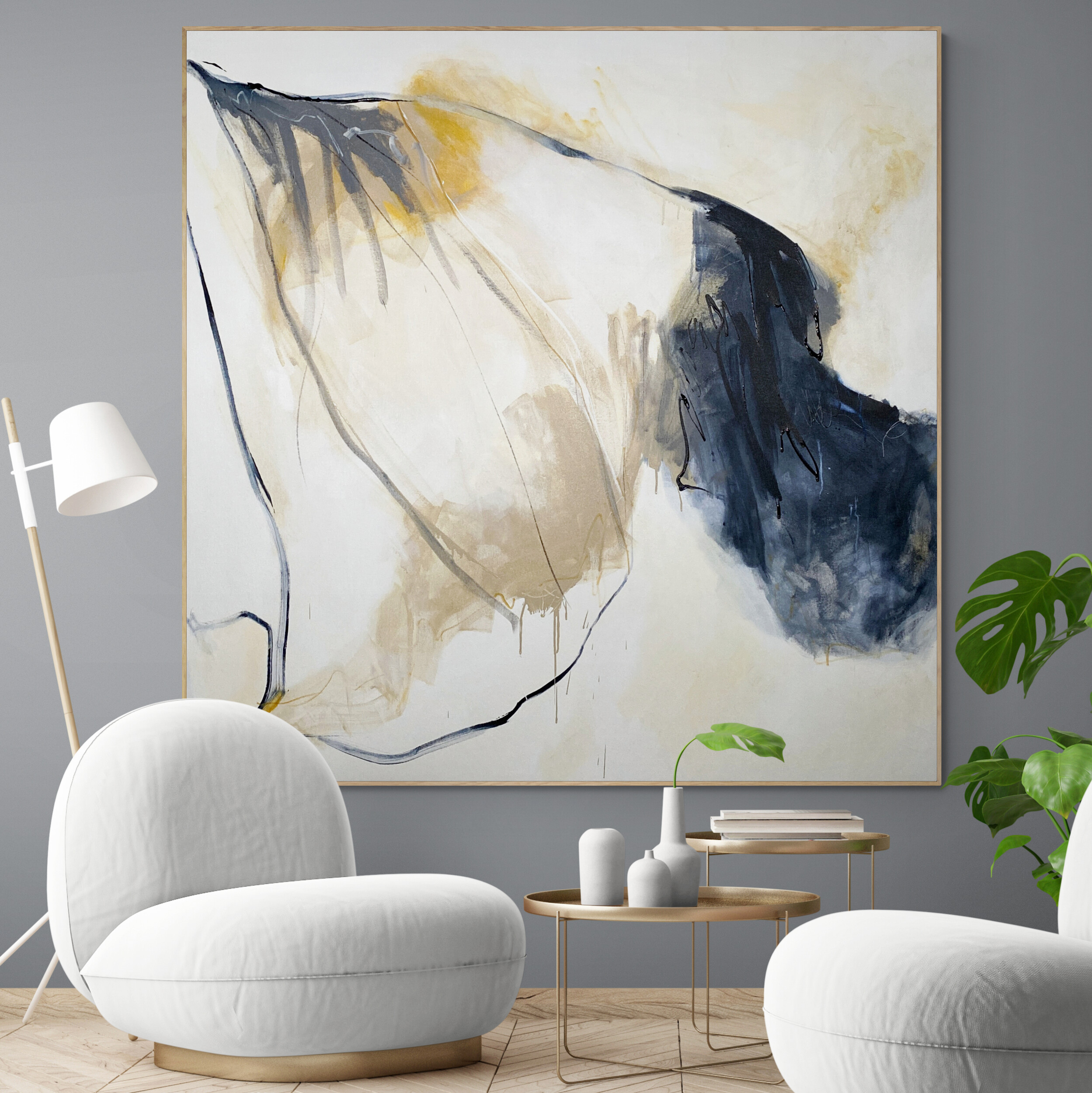 Broken Strings is a beautiful earthy statement painting perfect for the home or office. Its vibrant palette of warm yellow ochre, beige, grey, blue, black and white will come alive in any large space.