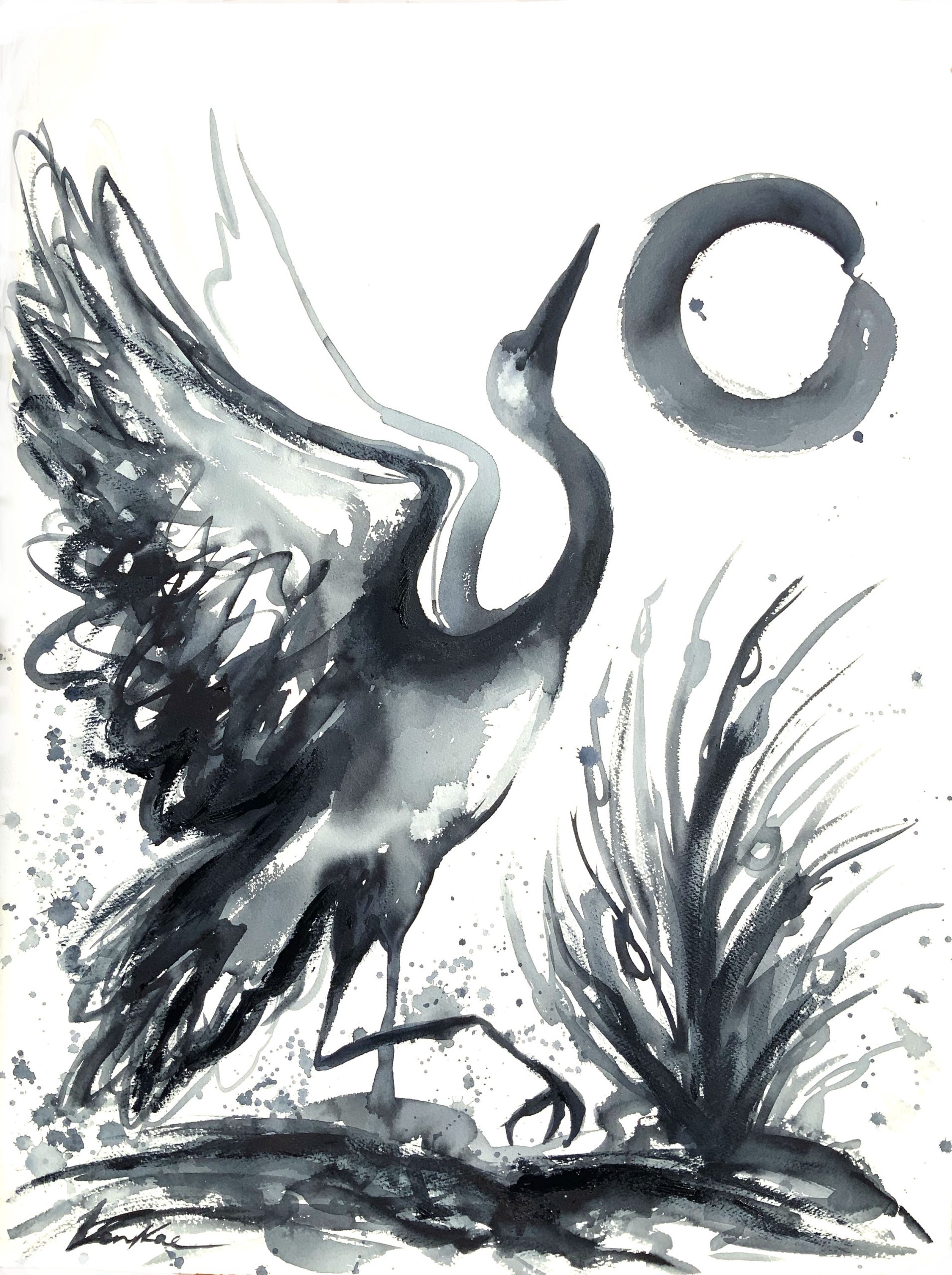 A sumi-e inspired painting of a Brolga dancing under a full moon, by Sydney artist Leni Kae. The brolga in this painting embraces the importance of celebrating the spirit of joy, reflected through its dance. Its joyful spirit dances even when on its own; expressing an independent spirit, and finding joy in each cycle of life under the light of the moon.