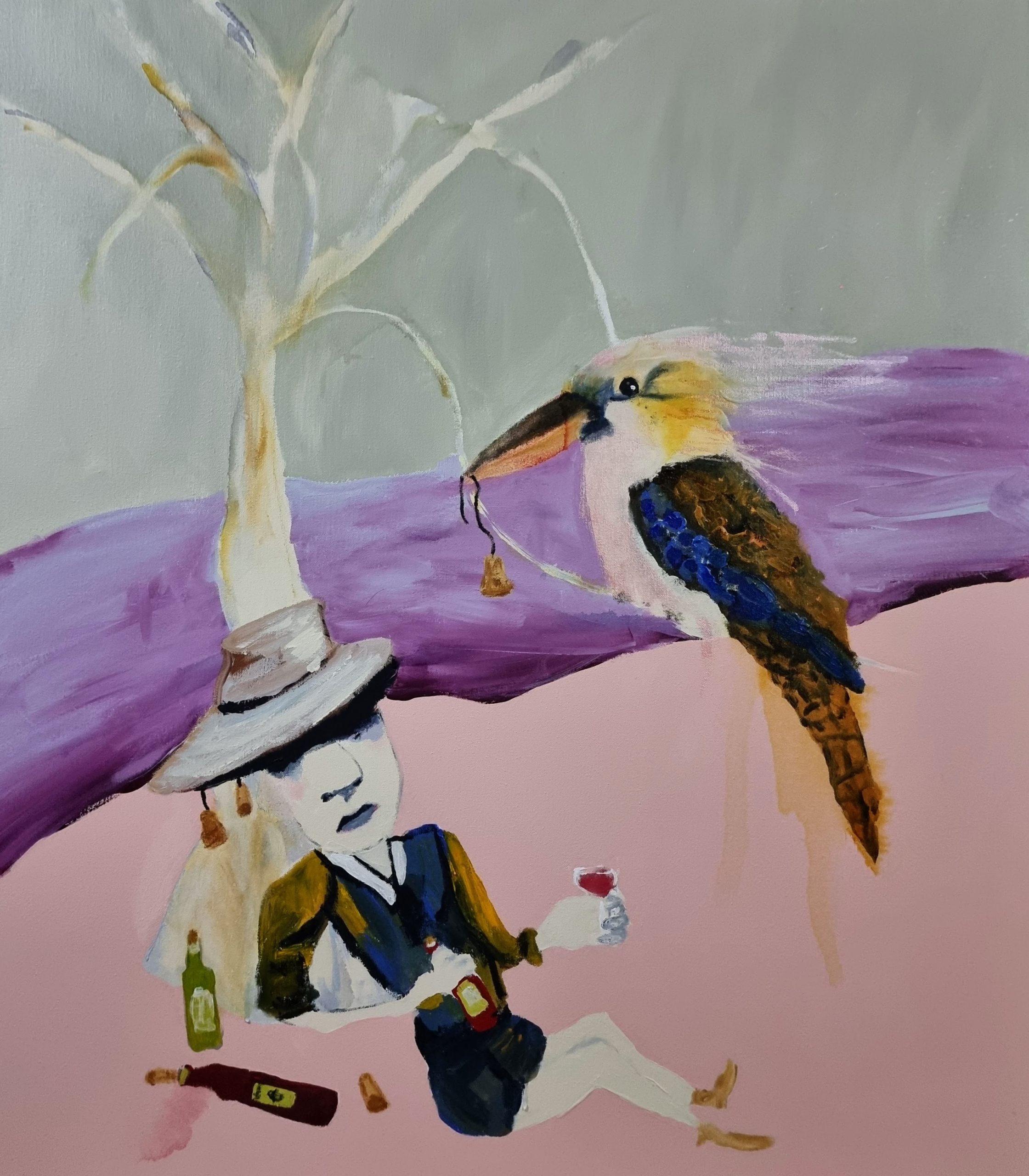 What’s more Australian than a farmer in a cork hat. Bruce is sitting in the shade of the eucalyptus tree assisted by his Kookaburra mate in the construction of his homemade hat.