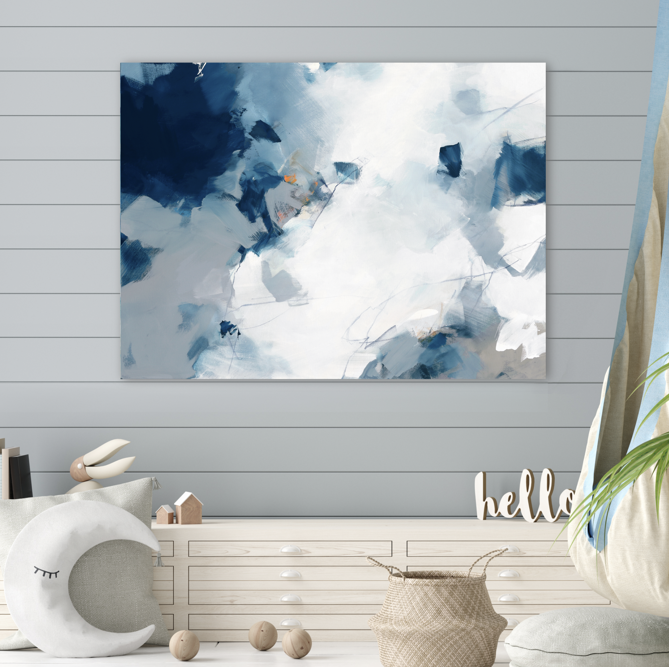 Brush Tango is a combination of navy, blues, grey and taupe with a touch of orange. The image extends around the 3.8cm sides of the canvas so it’s ready to hang.