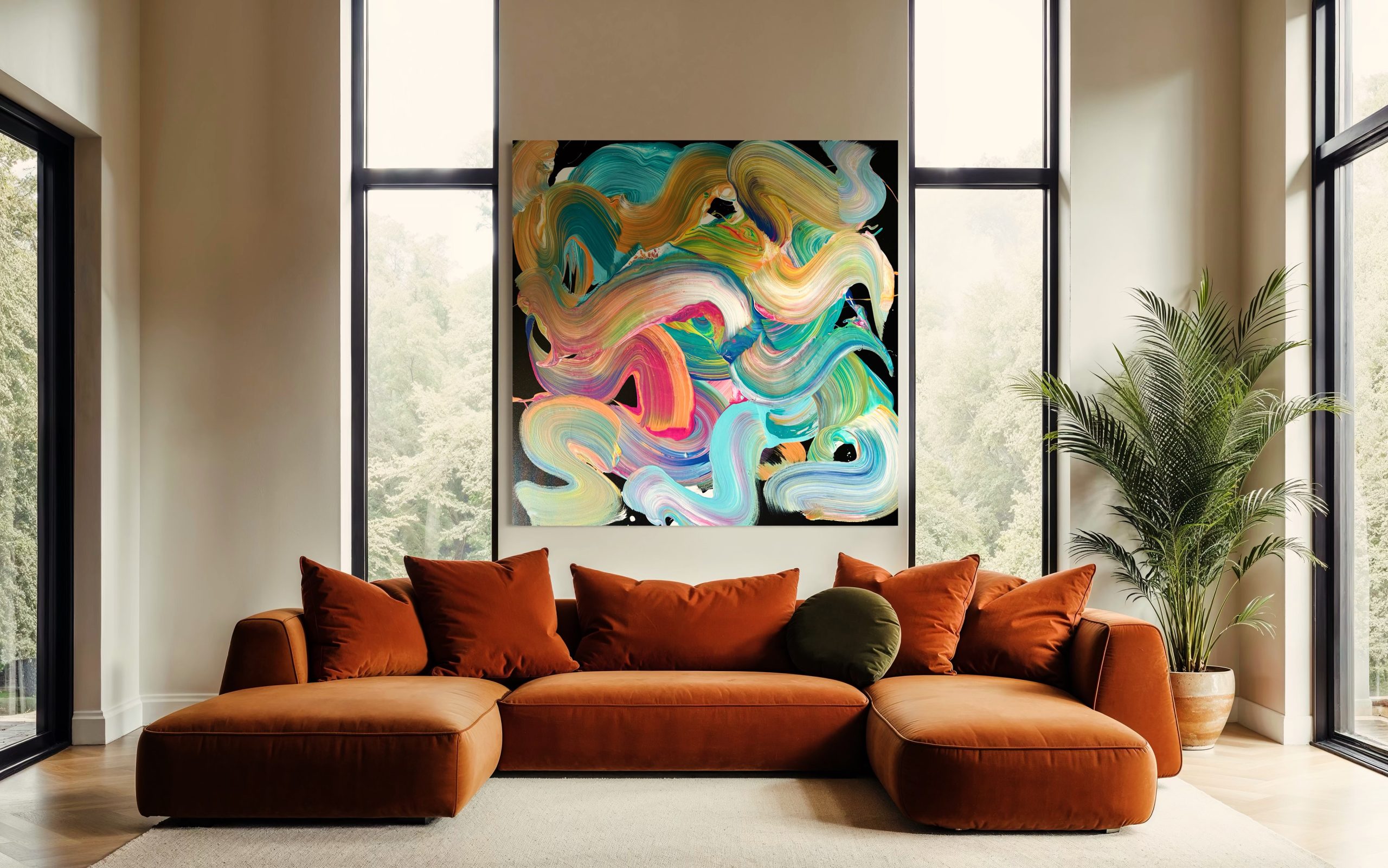 A dynamic abstract painting with big bold vibrant swirls of color intertwining in a fluid dance.