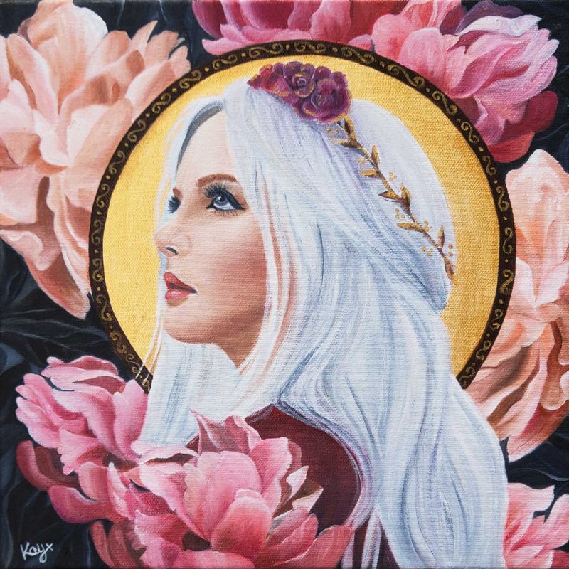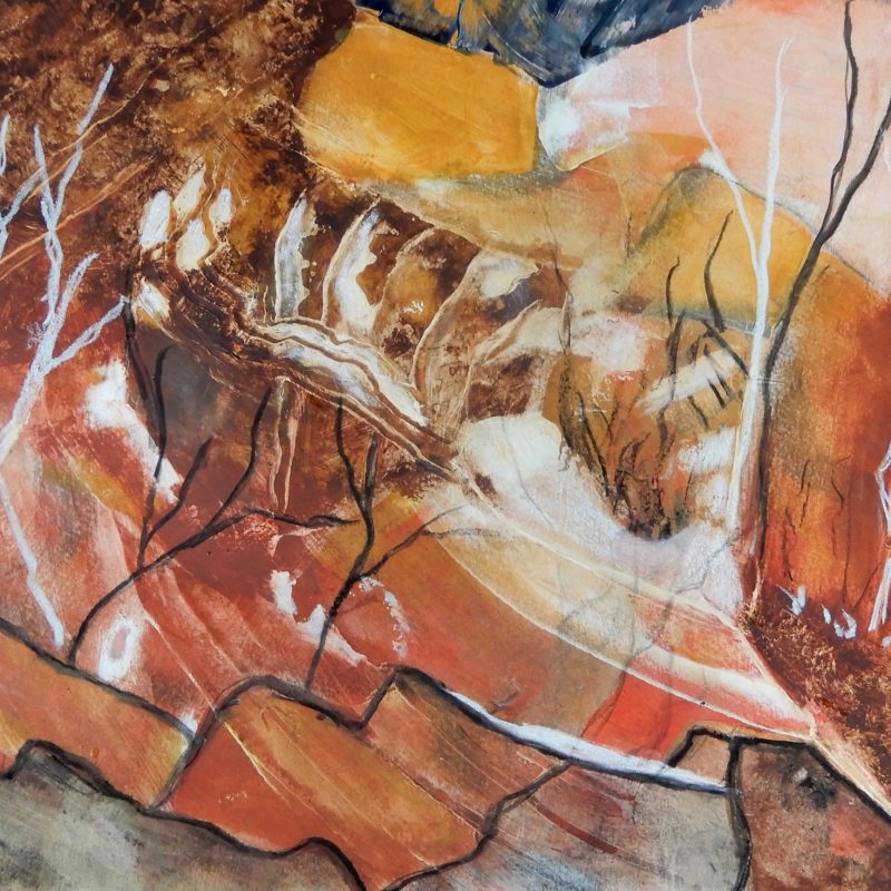 The painting is on canvas with acrylic and mixed media, mixed with glued paper and various pencils for details.