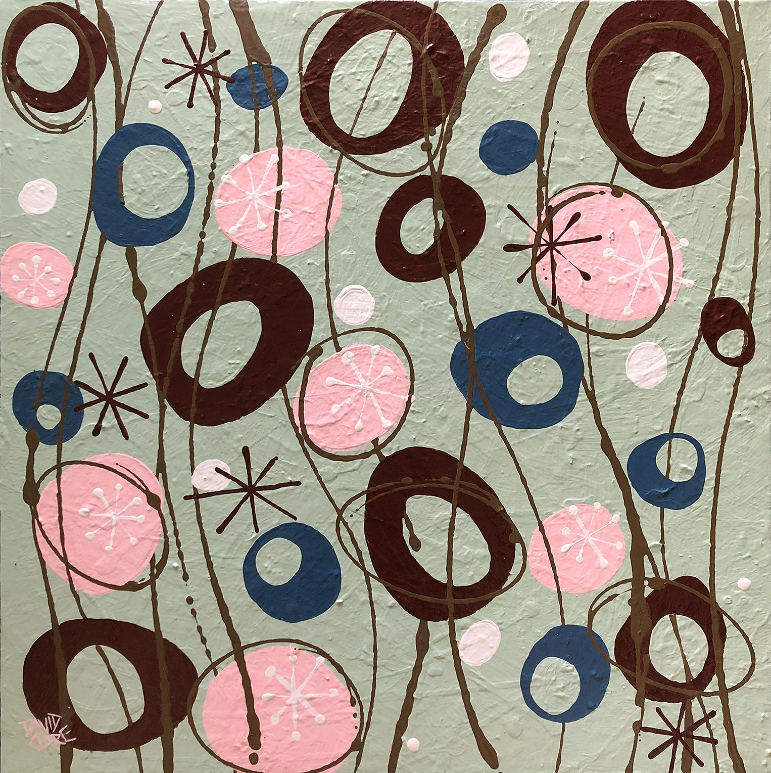 My latest inspiration/obsession…. Mid Century Modernism. I love playing around with these off-beat shapes and colours that are inspired by 50’s and 60’s architecture and art. The carefully hand painted shapes are highlighted with carefree drips of paint to add some unpredictability.