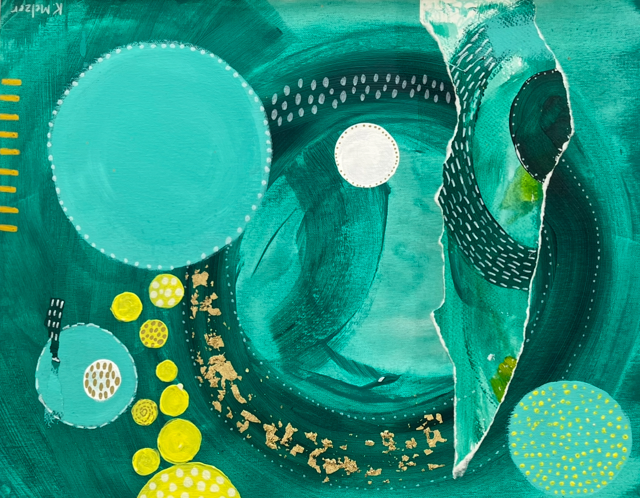 Bubble 003 by Karin Melzer -This is a unique piece whose green tones have greenish undertones, reflecting the gold of a fish swimming in the depths of the ocean. The yellow color symbolizes a school of fish swimming swiftly to hide in the coral reefs.