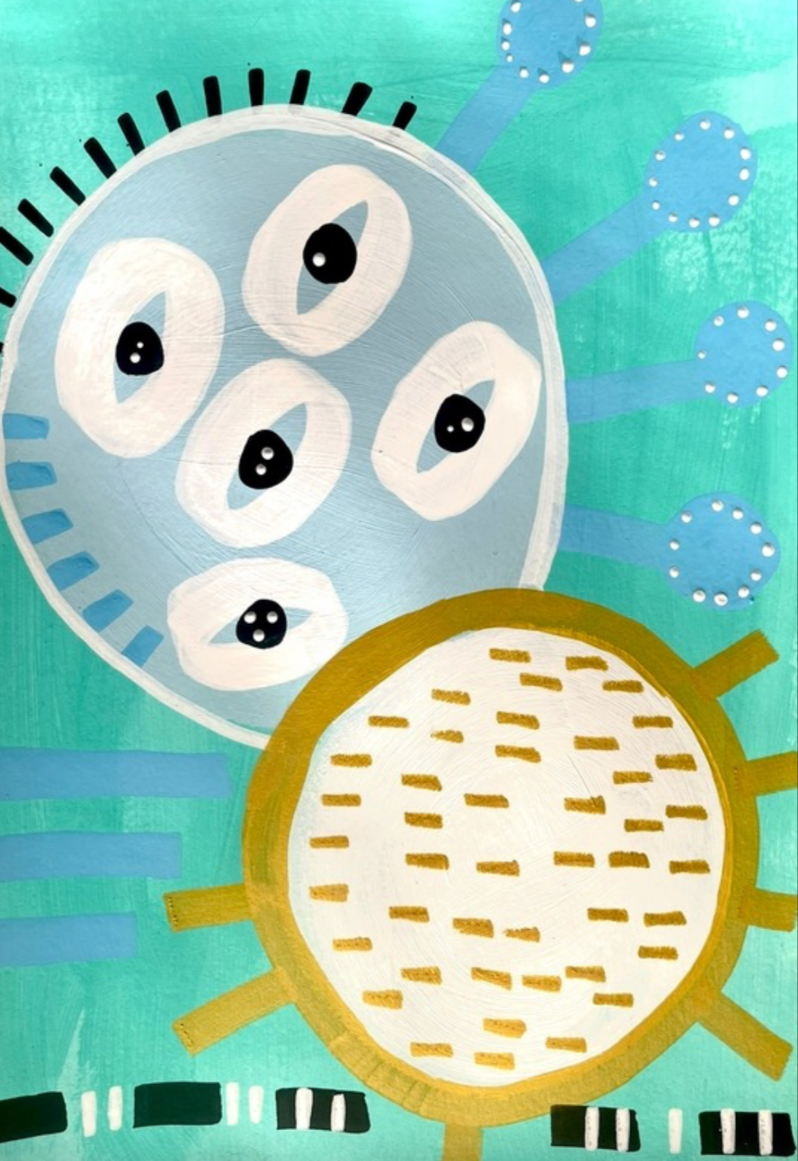 The painting is on canvas with acrylic mixed with glued paper and various pencils for details.