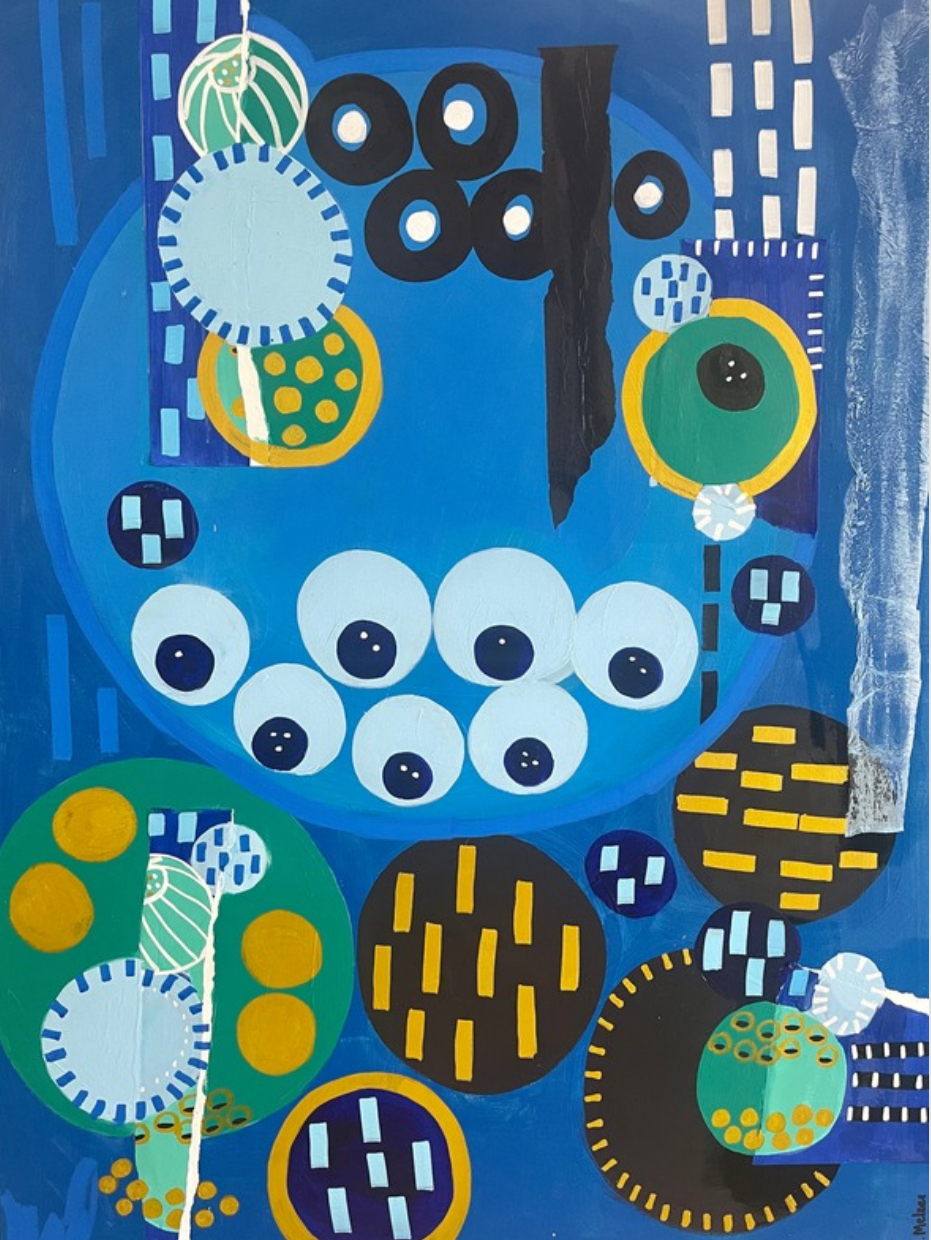 The painting is on canvas with acrylic and mixed media, mixed with glued paper and various pencils for details.