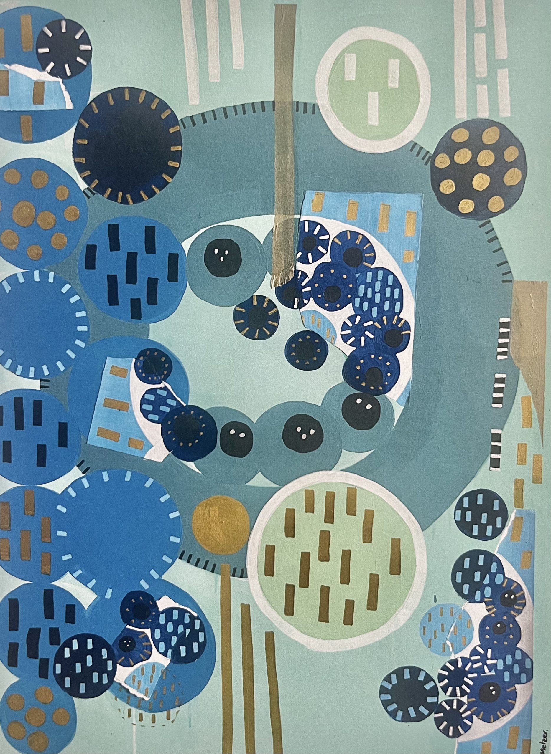 Acrylic and mixed media, mixed with glued paper and various pencils for details on canvas