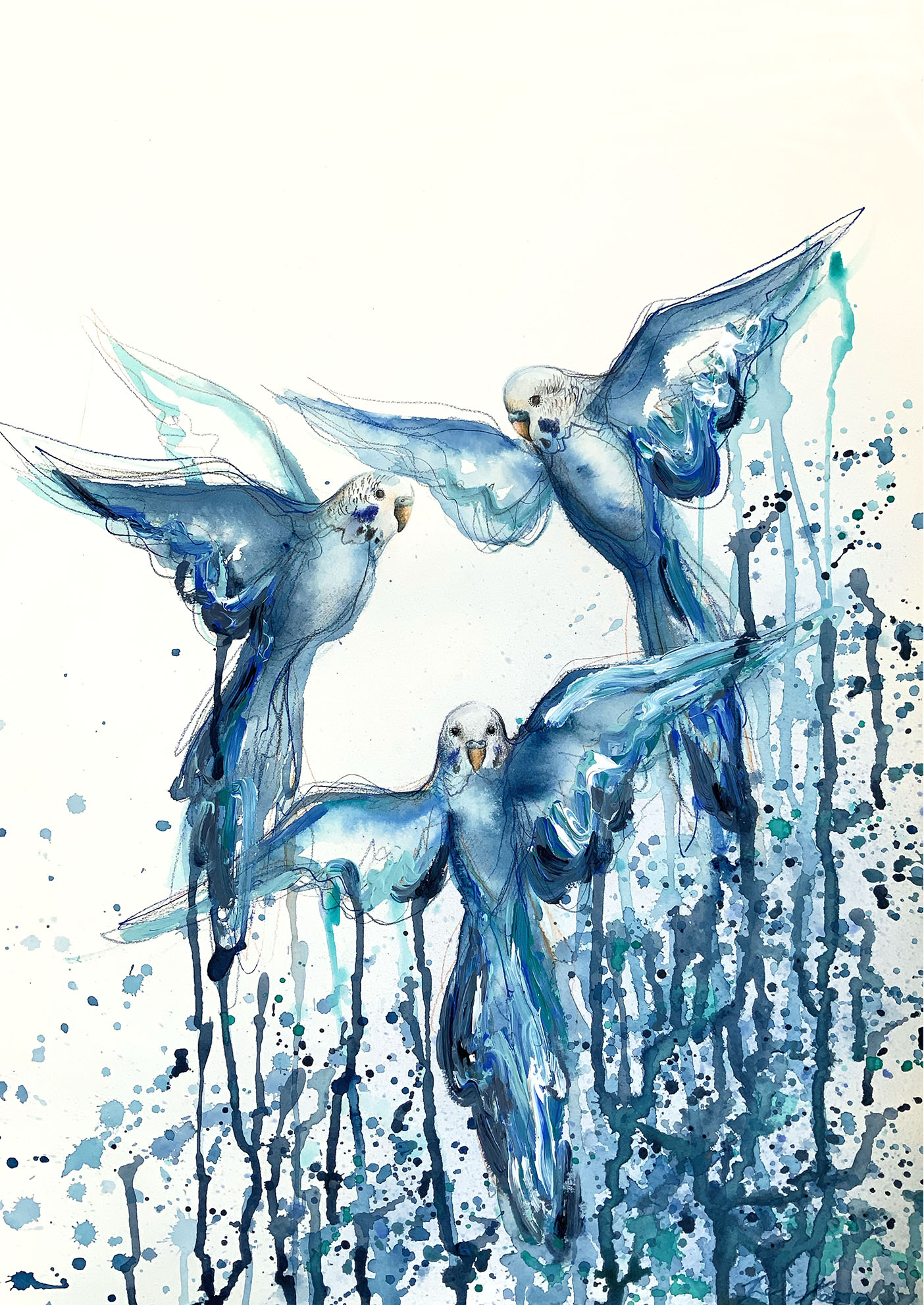 “Budgie Bath in Blue” by Leni Kae –  Original artwork by Sydney artist Leni Kae. A trio of beautiful blue budgerigars flying in a bird bath, with splashes of blue and green. Symbolising joy, fun, friendship and embracing the simple joys in life. A bright and beautiful addition for art collectors, or a unique gift for birdlovers. This artwork is from Leni Kae’s series titled “Animal Spirit”.