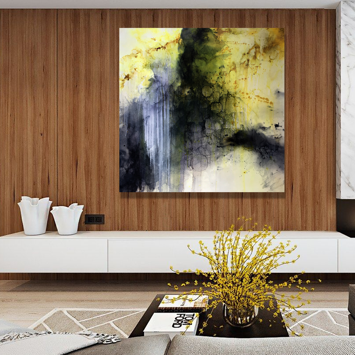 A large abstract using beautiful yellows and golds mixed with greys and black inks and acrylics. Very calm and peaceful.