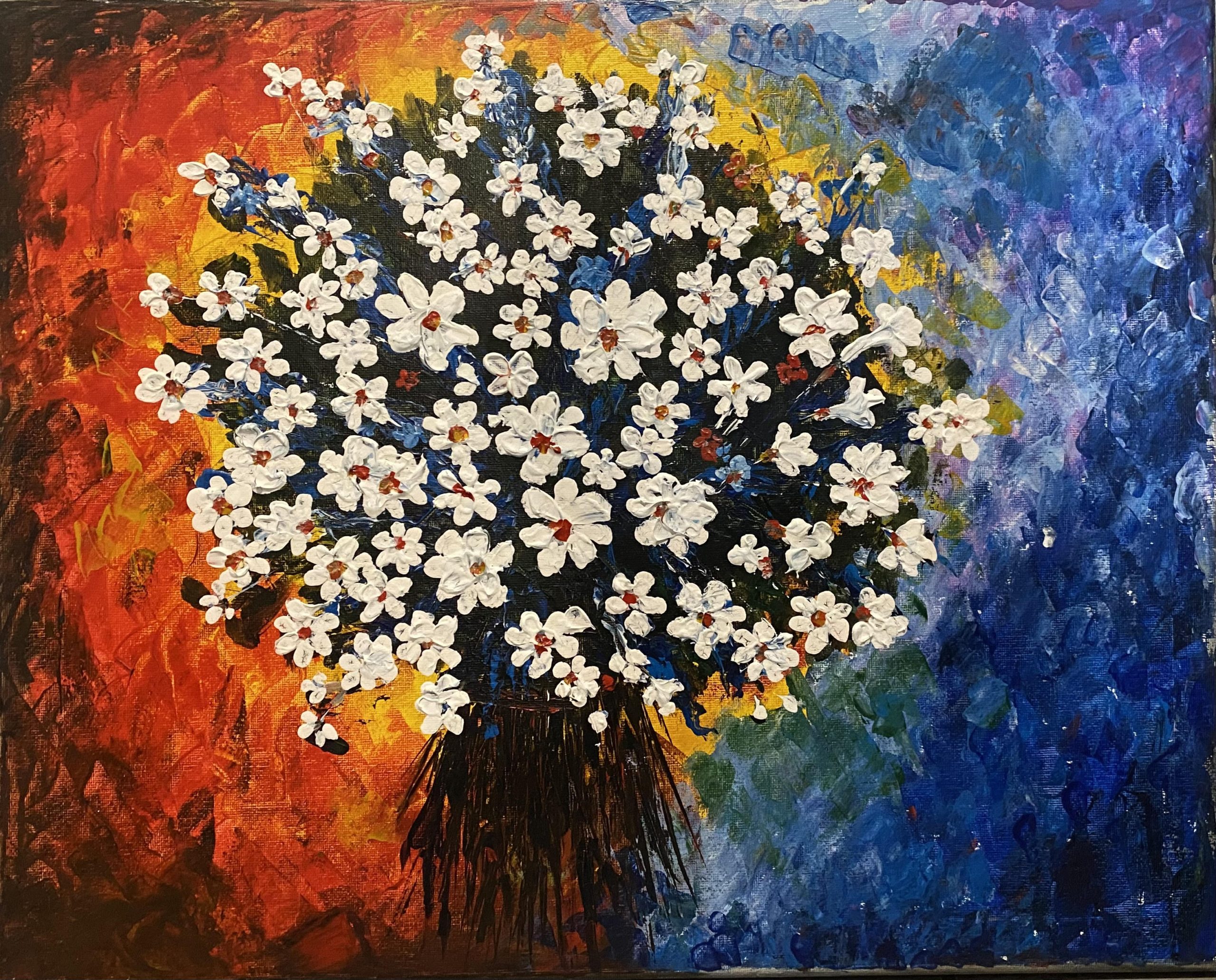 In this captivating flower bunch painting, a profusion of blooms bursts forth in a riot of color and fragrance. Delicate petals unfurl in a kaleidoscope of hues, from the soft blush of roses to the fiery orange of marigolds and the vibrant purple of irises.