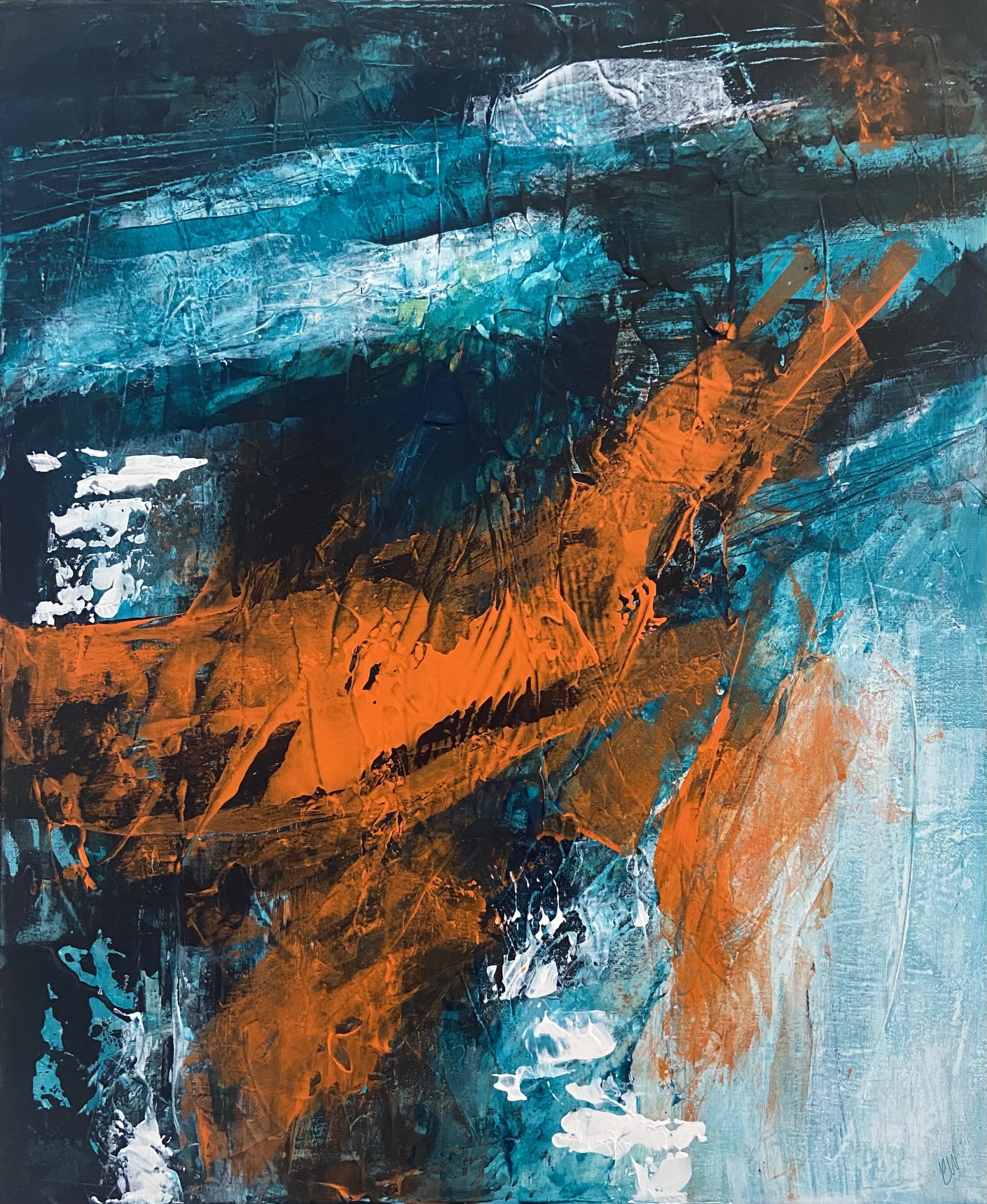 Burning Bridges by Carrie Welsh is a beautifully textured abstract piece. 50 x 60cm Acrylic on canvas, ready to hang. Frame not included.