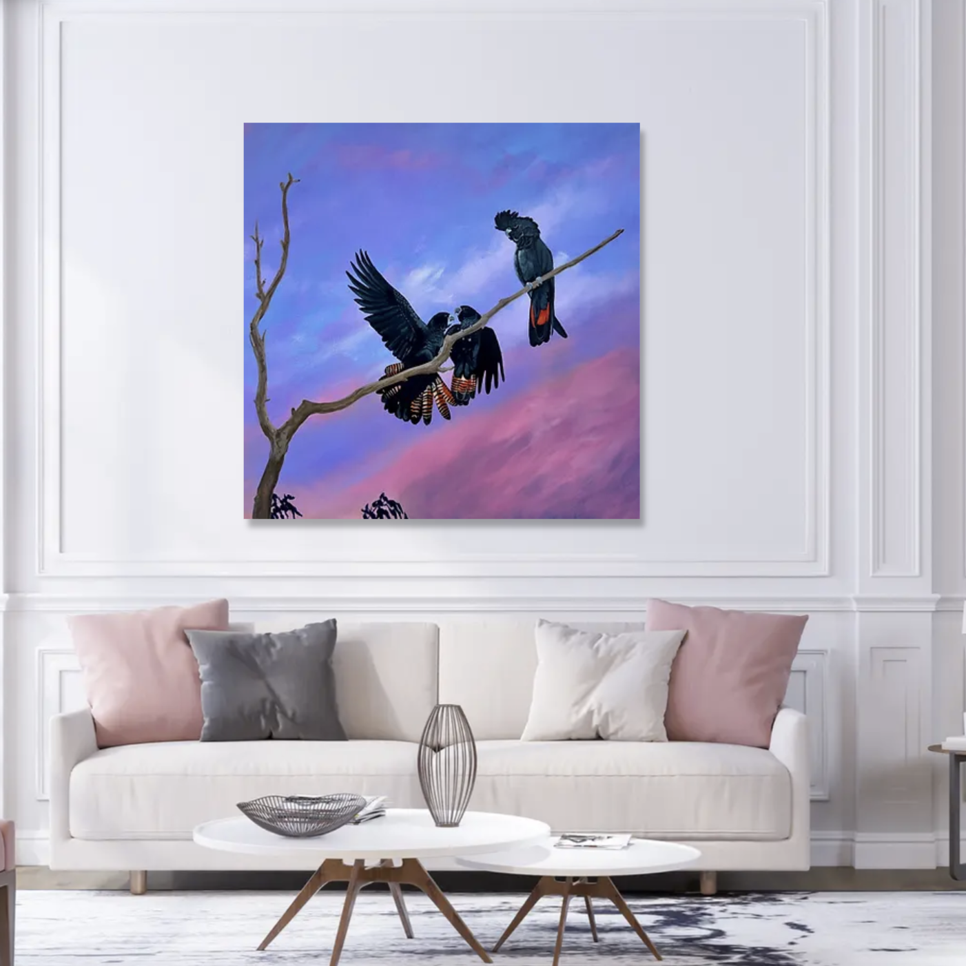 Ignite Your Passion with Black Cockatoos and the Fire Element. Bring powerful symbolism and vibrant energy into your space with this striking artwork featuring three Black Cockatoos, set against a palette of pink with hints of red—colours that represent the Fire element in Feng Shui.