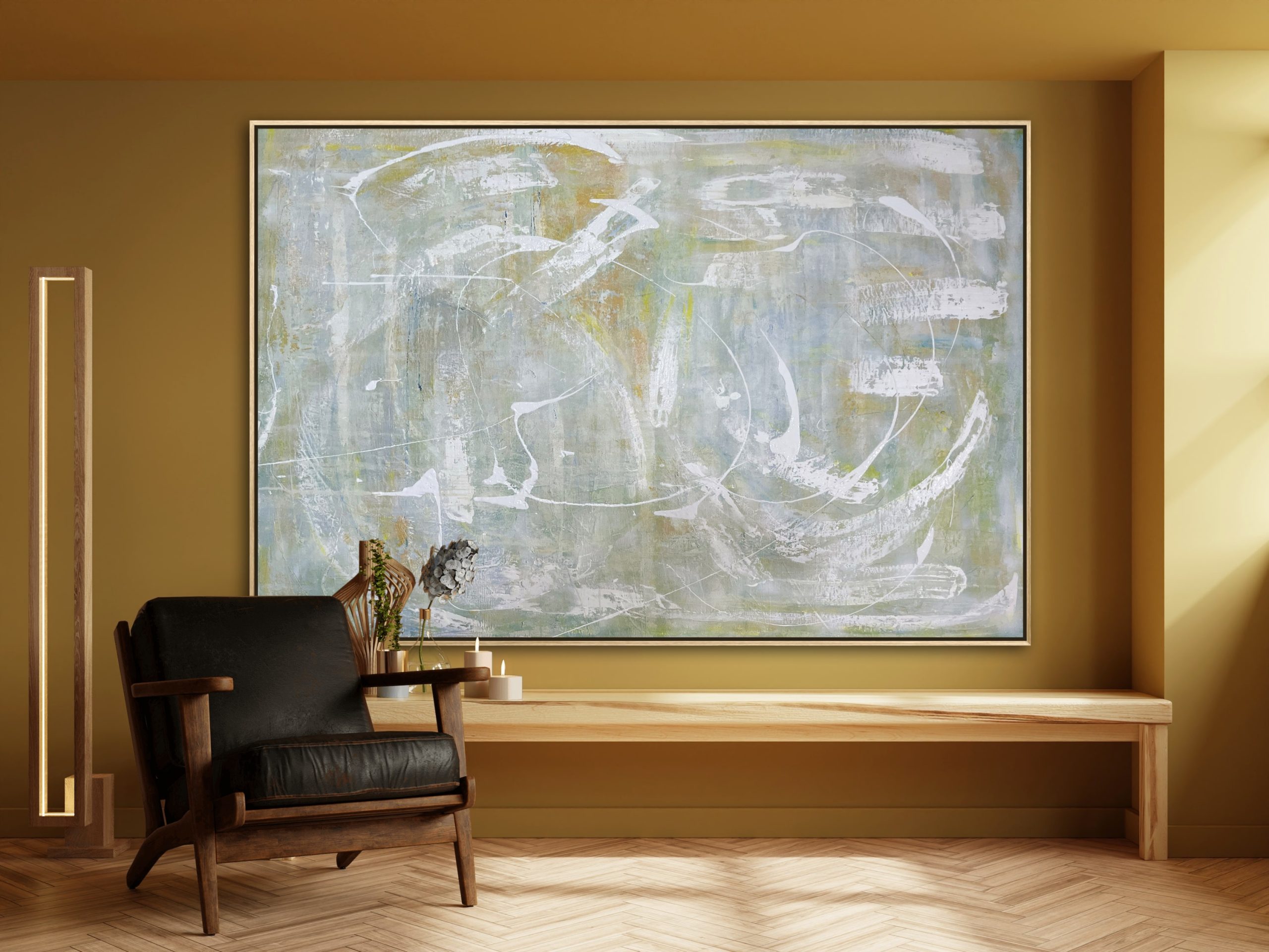 The title for this painting is inspired by the process Alicia went through to create the painting. Painting, scraping, sanding, washing, scratching and rubbing to create the heavily textured, almost shiny background for the titanium white paint she applied over the top.