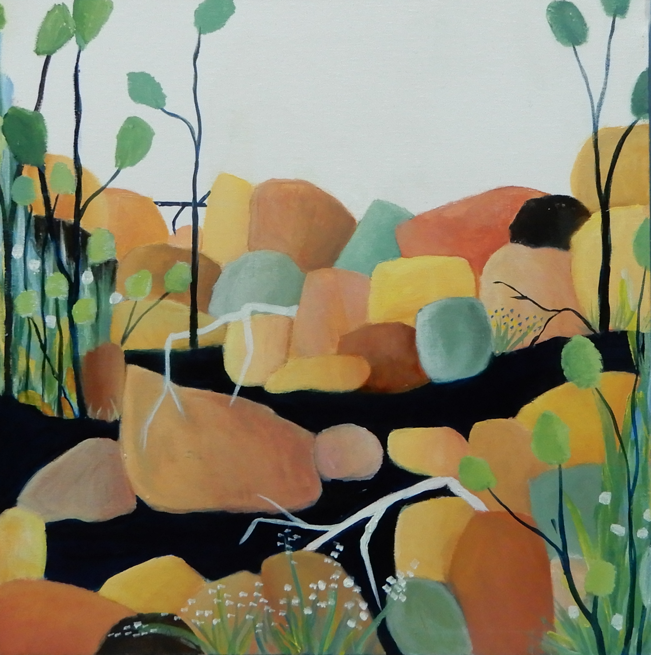 A contemporary landscape painting inspired by the colours of autumn – my favourite season. The burnished hues of this palette have informed a series of works exploring large rock forms in hills and ridges, and the lovely rhythms of where they have come come to rest.