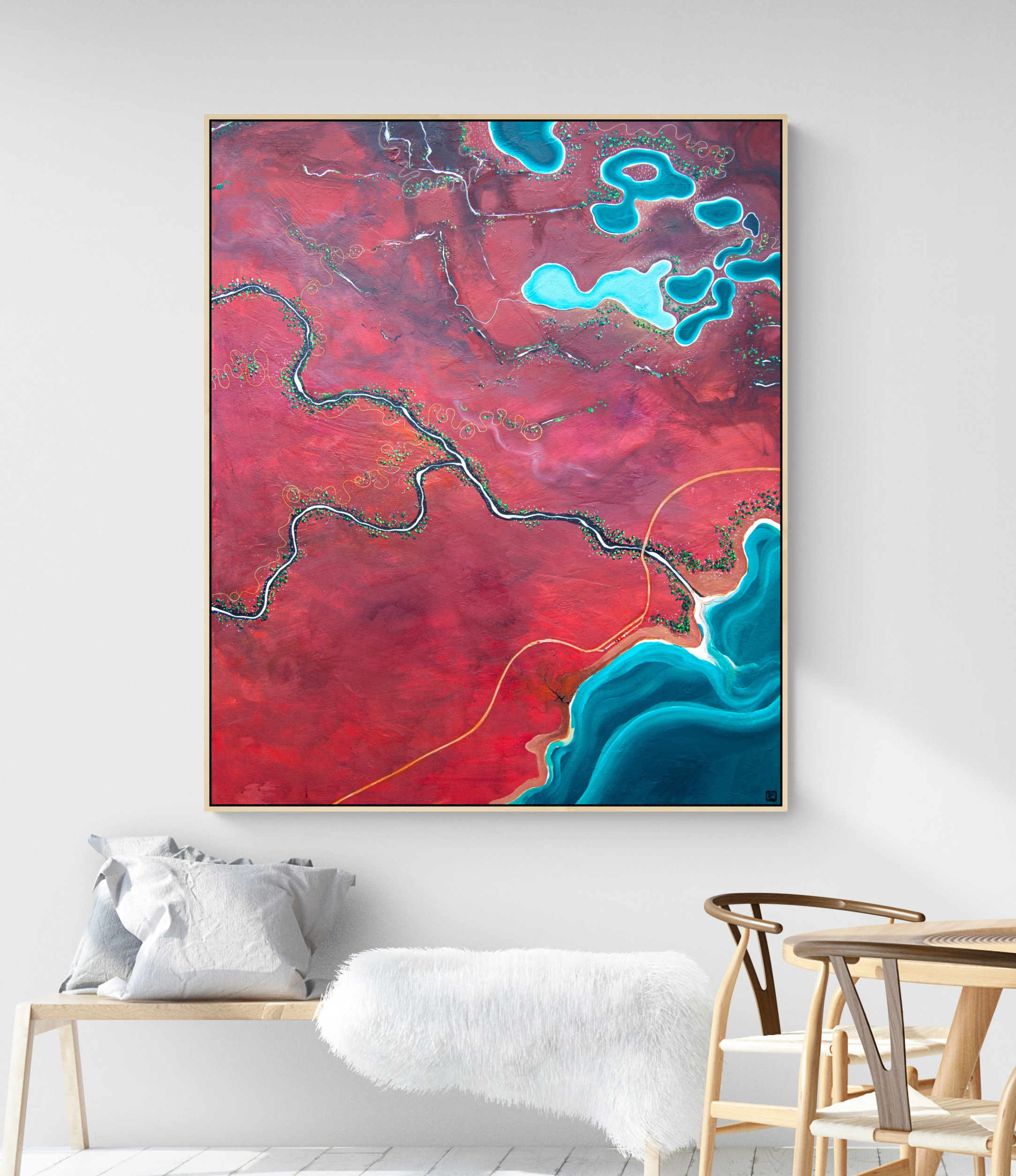 Burnt Country Dreaming by Tania Chanter is an aerial abstract landscape inspired by the rich and vibrant tones of Australia and the changes of light and mood throughout the day. Tania’s hope is that this painting brings a sense of calm to the room where it lives, and that is makes the people who enter the room feel as though a part of nature is right there with them.
