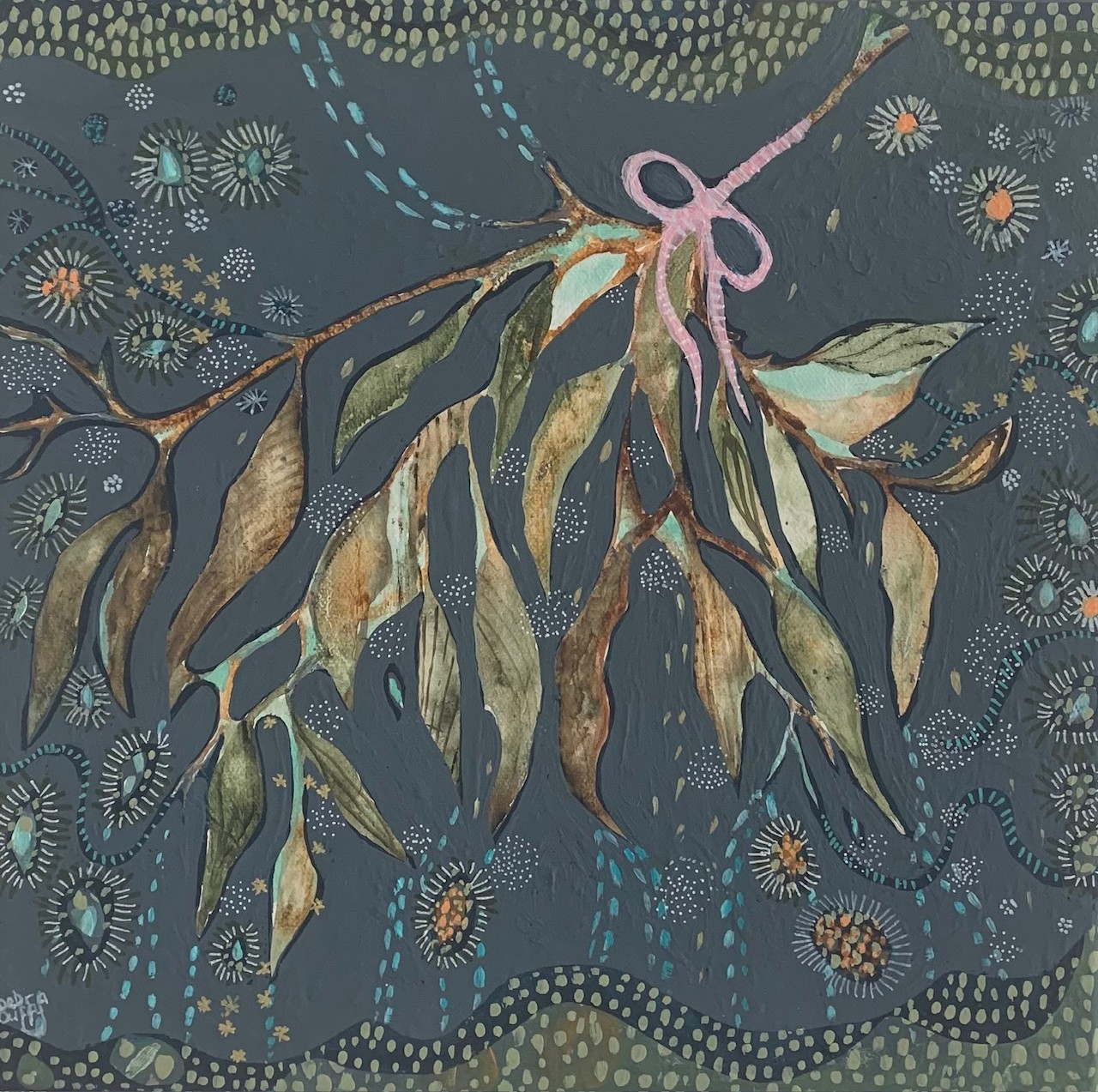This artwork is an one of a kind original using the contrasting textures of watercolours , acrylic paint and artist markers. My inspiration comes from living on the doorstep to the Blue Mountains NSW and being surrounded by enchanting wooded forests filled with natures best. ‘Bushland Posy’ features a rustic cascade of Eucalypt leaves a perfect little bunch that I discovered on my pathway of my usual walk and was immediately inspired! This led me to paint this evocative creation and it seemed so fitting to include a delicately twined pink ribbon, which for me a symbol that represents hope and celebration.