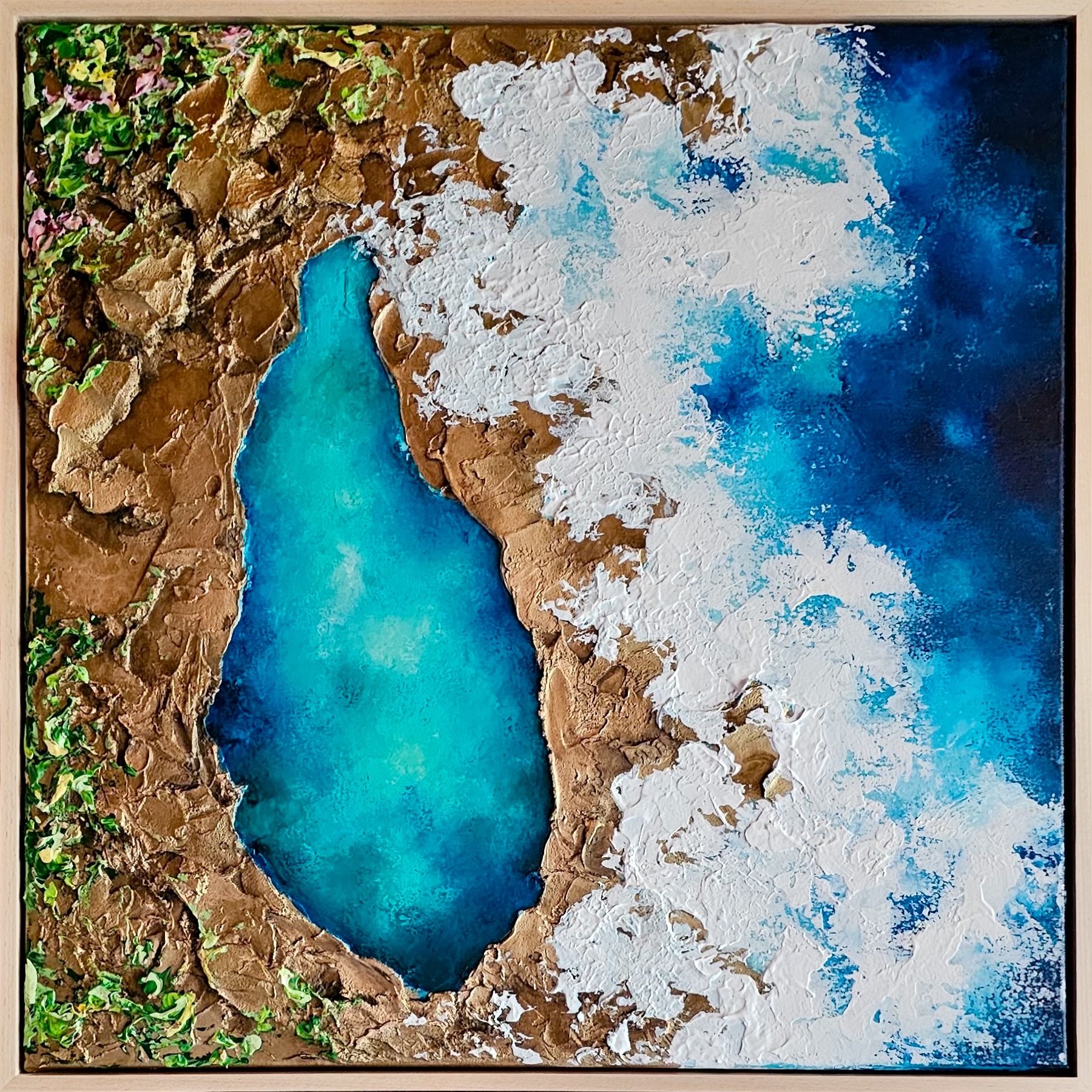 Some of my canvases are ordered with a float frame, usually the most popular is a Tasmanian oak frame. If you prefer to frame the piece once the painting is finished, I can assist you in organising a custom frame or you can choose to arrange framing yourself.