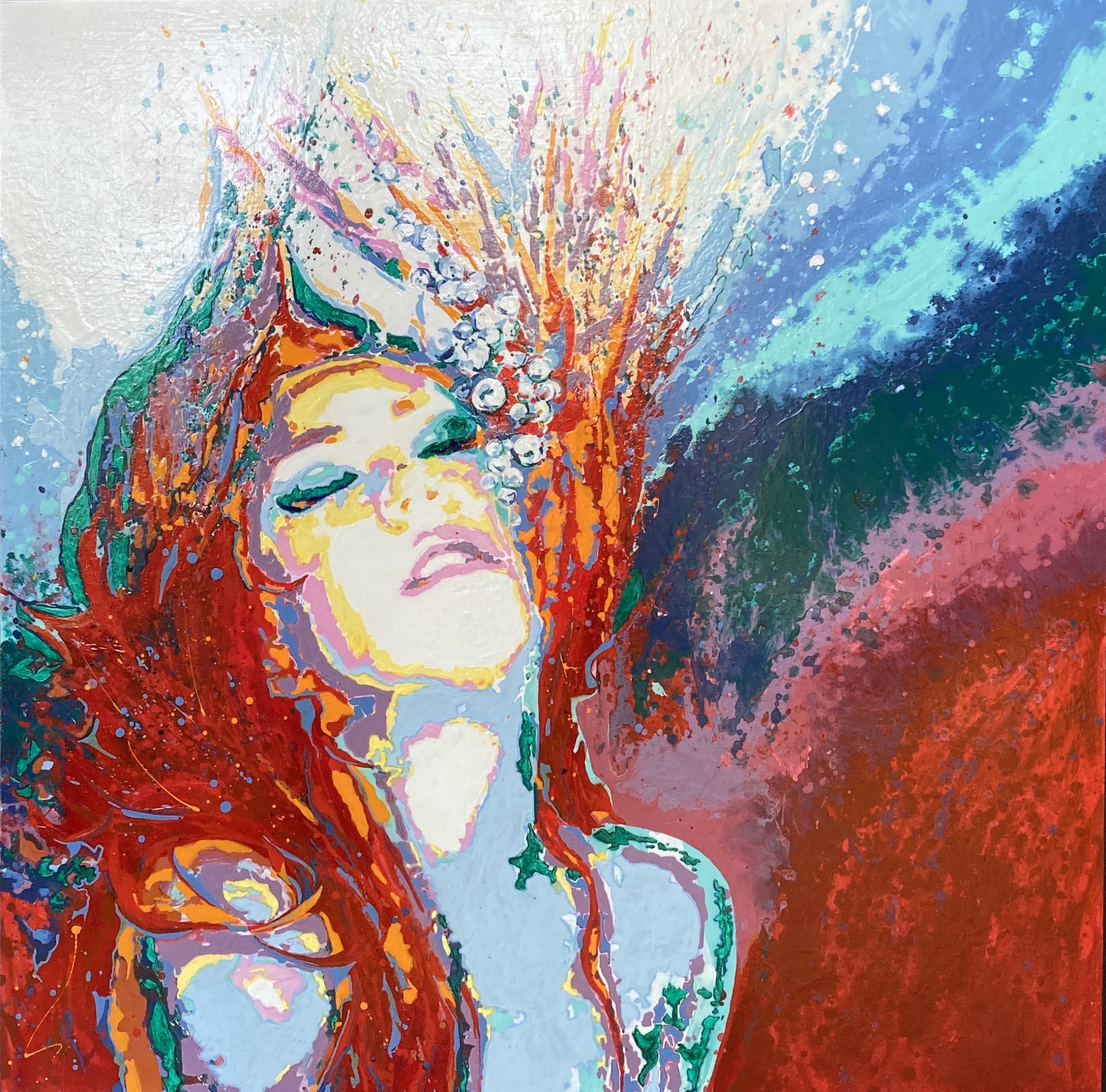 I work from created and found photographs and film stills, and this image caught my attention from the rapturous expression on the models face. It appeared she was experiencing something sublime. I wanted to capture this heightened expression with the fiery red that I’ve used in contrast to the cool greens and blues of the background. I wanted to capture the heat and the sparking energy! In this square composition of an underwater world, the light highlights her face and the bubbles she’s letting out of her mouth and nose. Use of contrasted colours such as red and pthalo green helps to guide the eye. I have developed my style using contemporary art techniques such as expressionism and pop art. The resultant painting is an energy filled WOW moment that repeats in waves. Named after an Emily Dickinson poem “I started early – Took my dog” where Dickinson refers to the “sea” rising along her body.