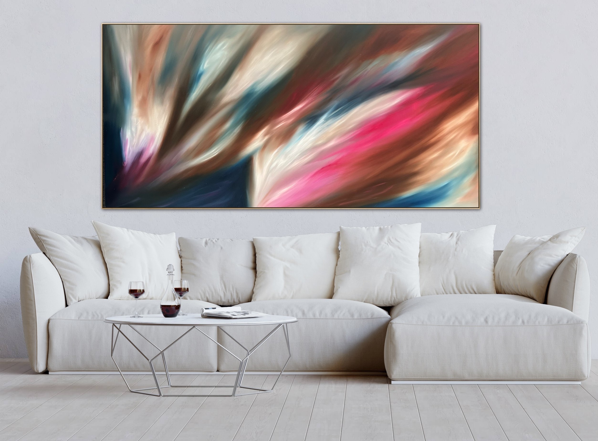 This oil painting has a sense of movement and flight about it with earthy tones and bursts of vibrant colour, it can be hung in either direction.