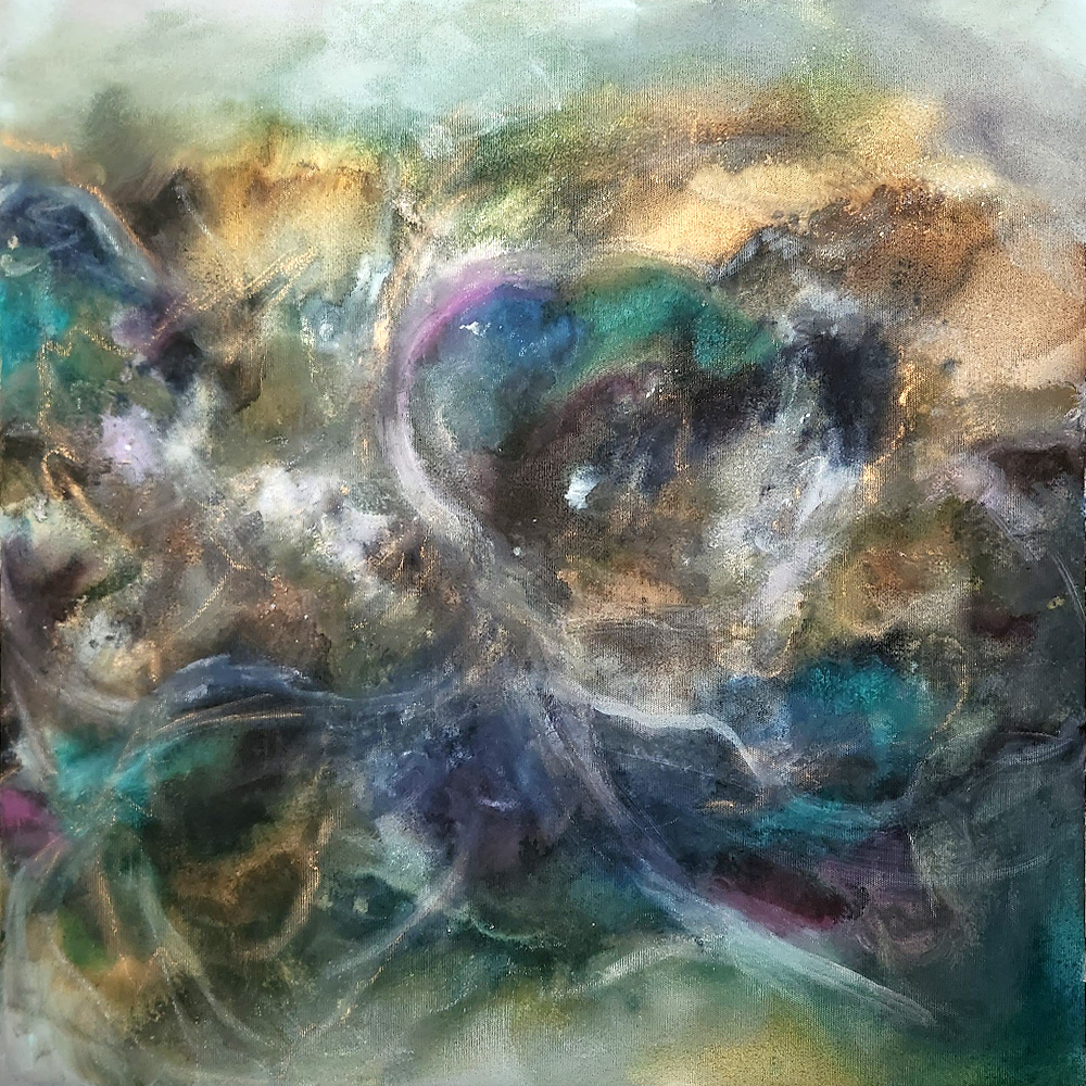 This artwork is an original mixed media with acrylics, acrylic inks, pastel, pigments. Colours of blues, greens, purples, warm and earthy golden tones, white, teal.