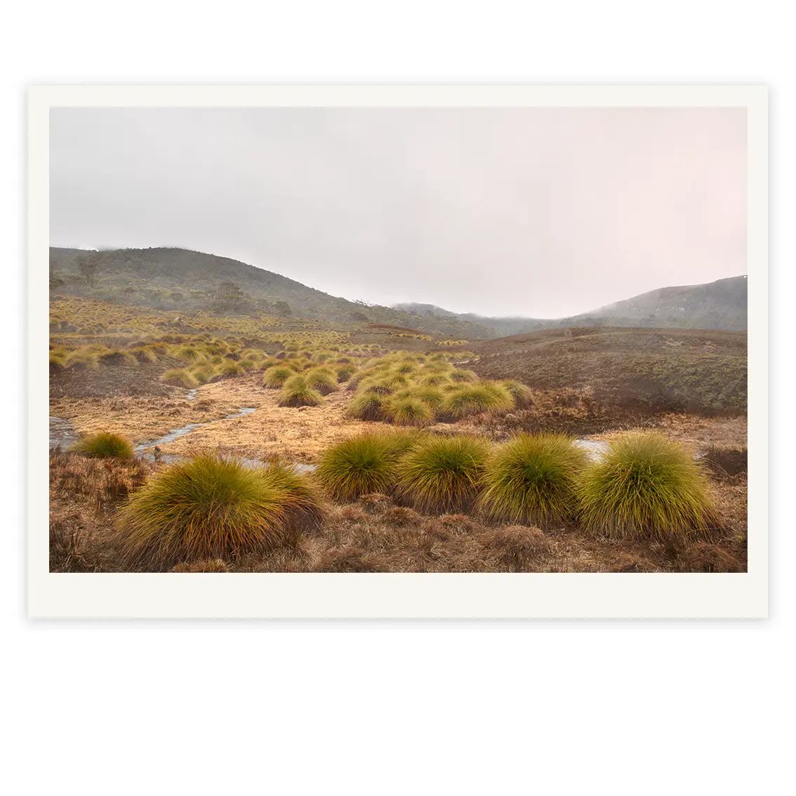 Pastel skies and angled rain envelopes the warm, tawny tones of Tasmania’s endemic button grass plains. Captured near Cradle Mountain, this scene highlights a quiet beauty where weather and light shift the landscape’s character. The button grass, often overlooked, is the star of the composition, textural, sculptural, and distinctive. Buttons invites a contemplative gaze, revealing the understated drama of Tasmania’s wild high country.